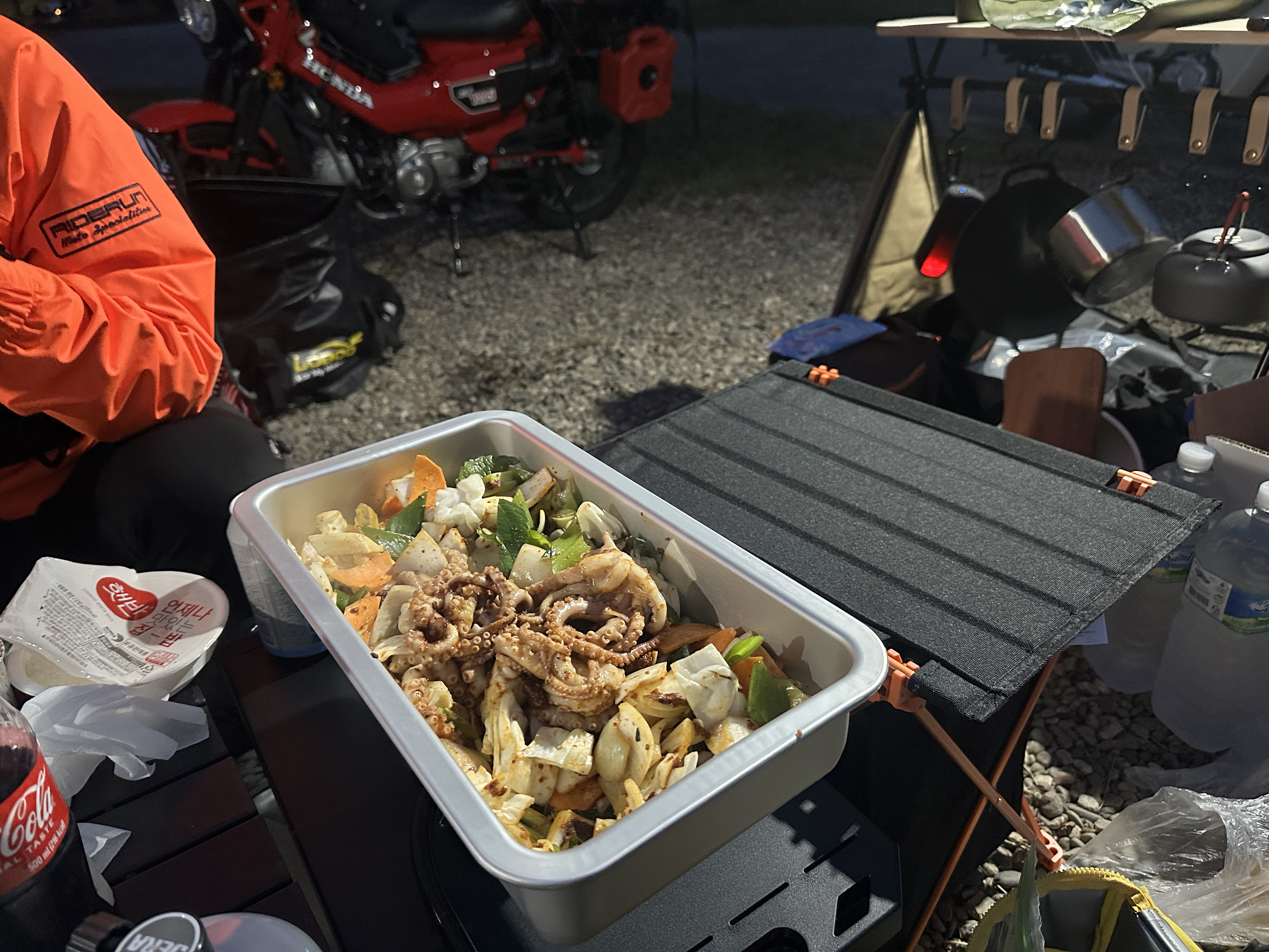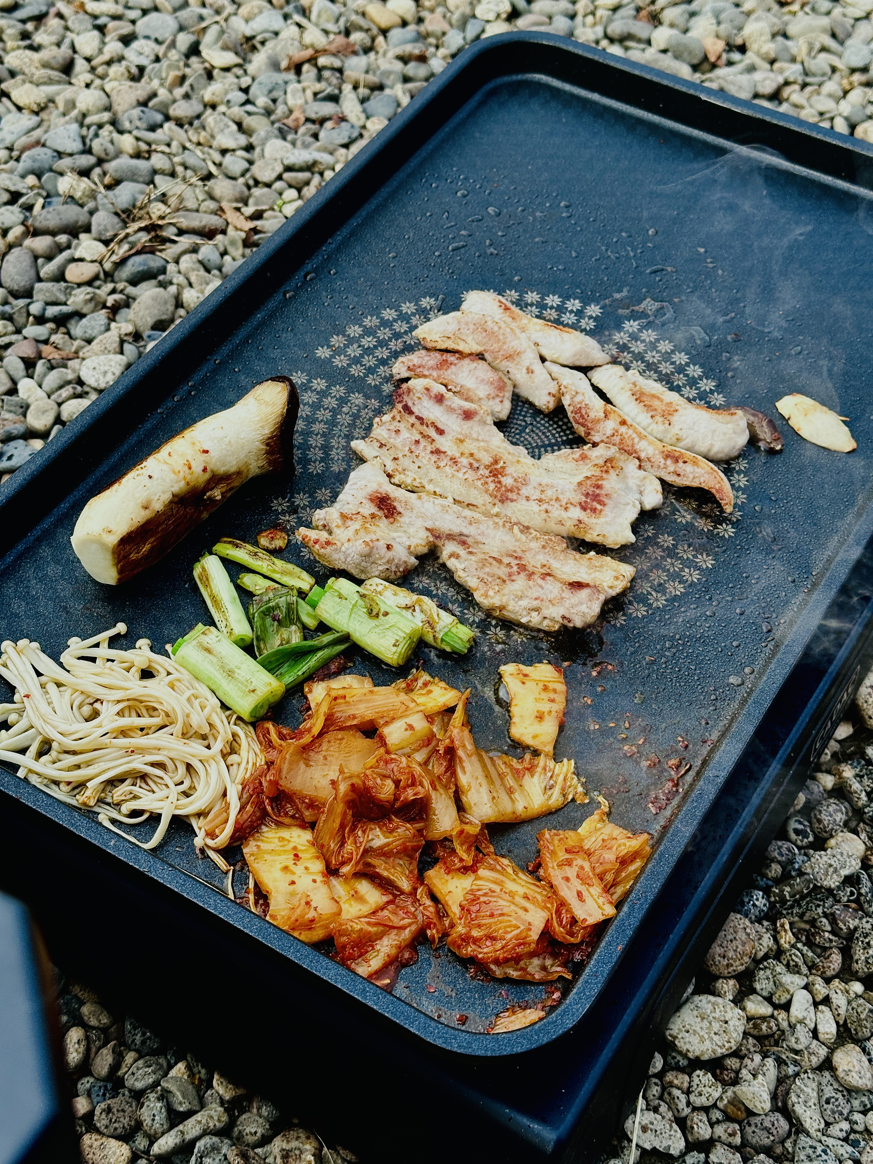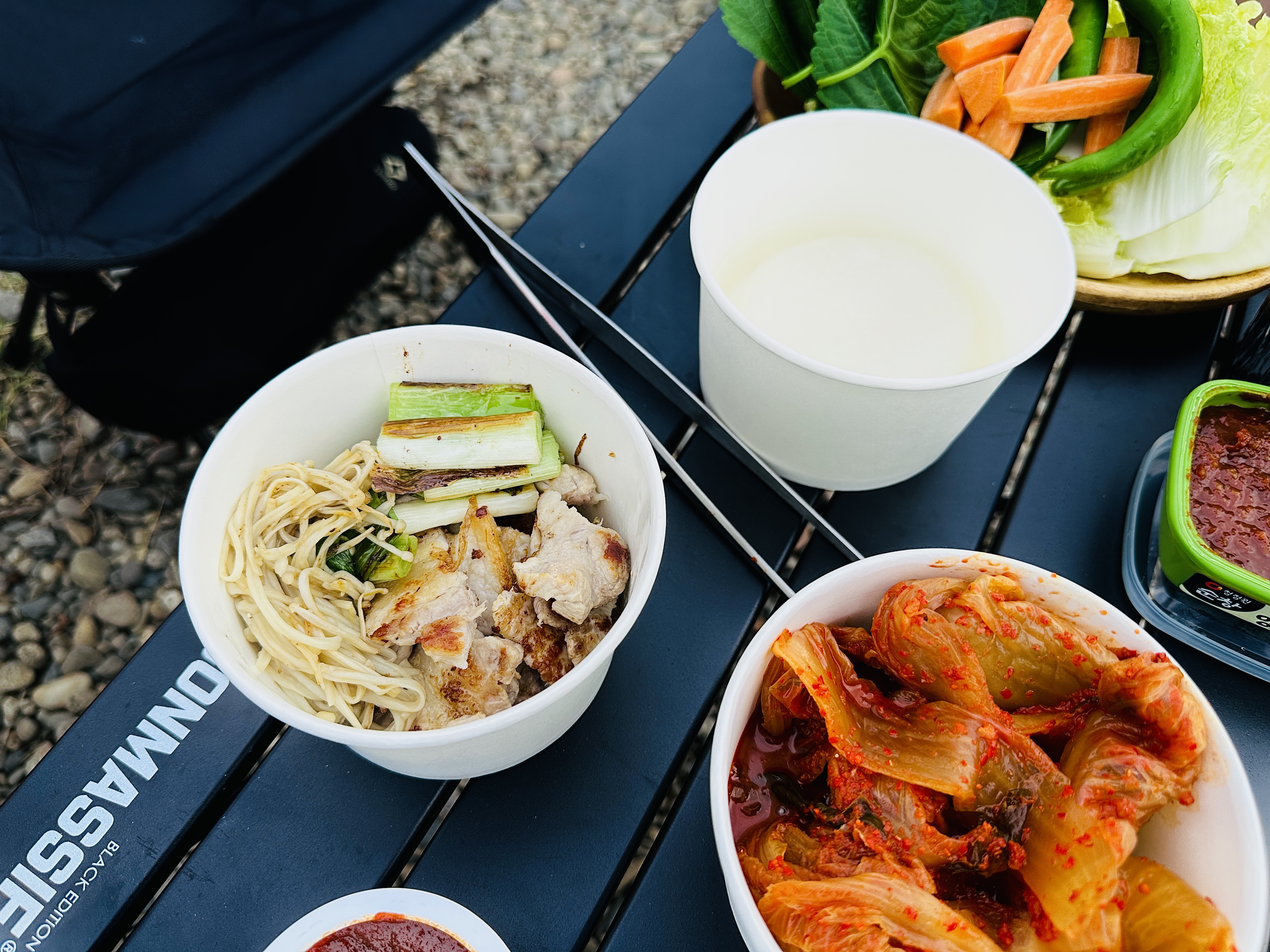 낙지볶음은 전날 저녁에 양념 소스 만들어 놓고 낙지 손질해서 가져왔는데, 낙지를 볶을 냄비가 없어서 라면 냄비에 담아서 볶다가 밑이 다 타버려서 고기판에 올려서 다시 볶아먹었다. 흑. 다음엔 팬 잘 챙겨야지.