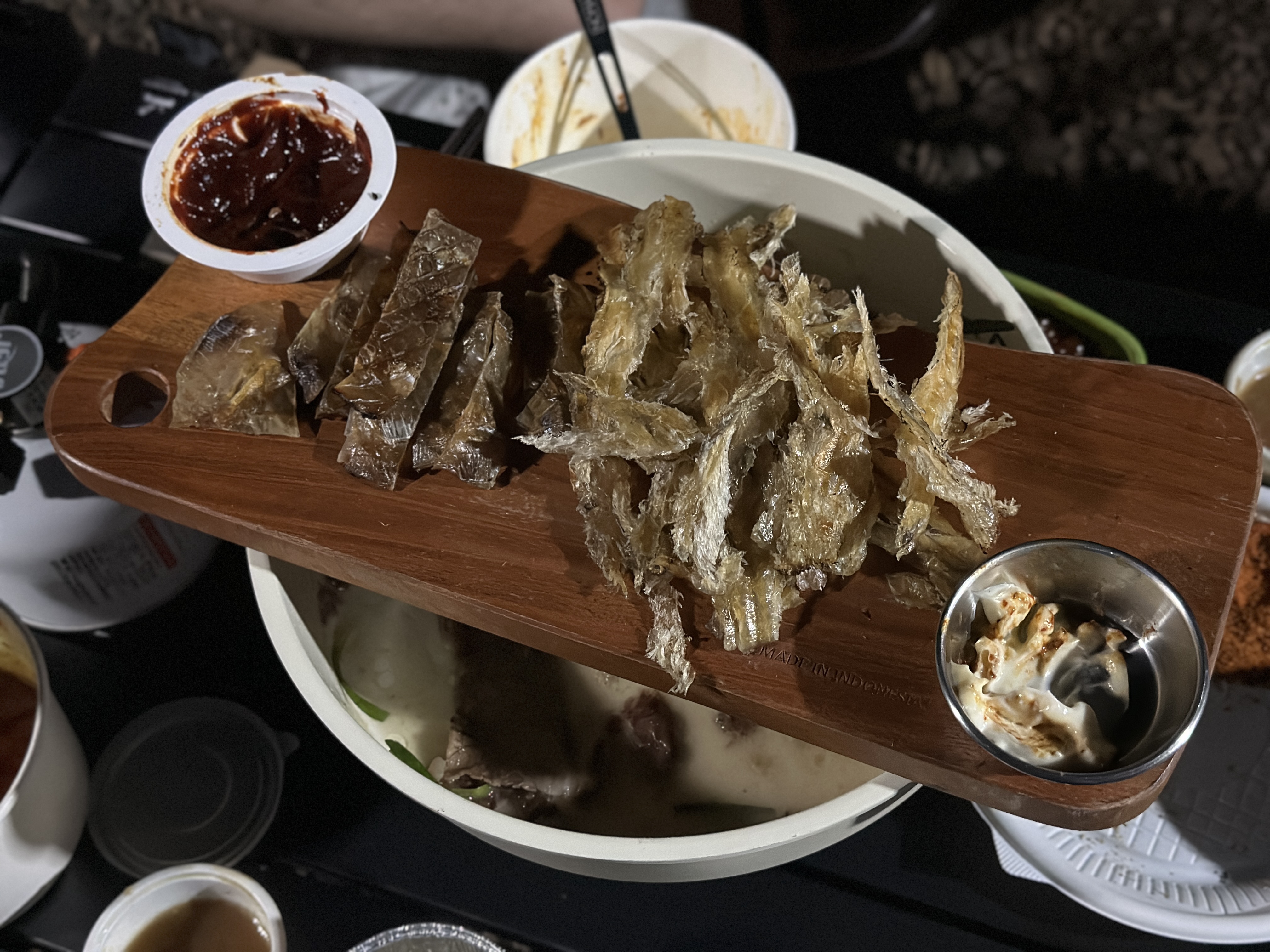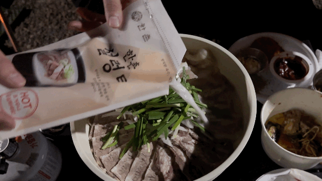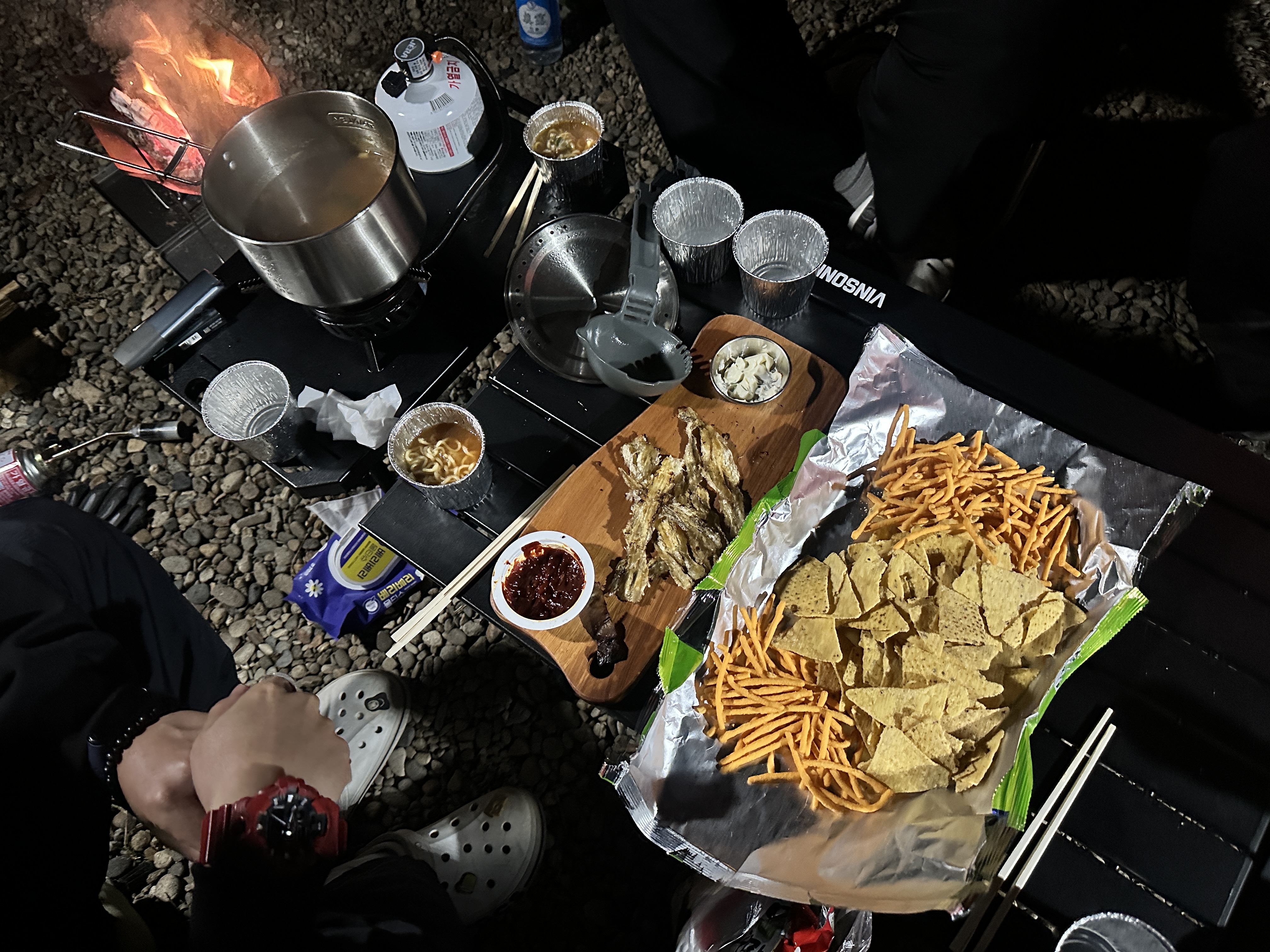 고기, 낙지볶음, 수육, 라면, 아귀포, 과자, 너무 과식하고 다들 해산.