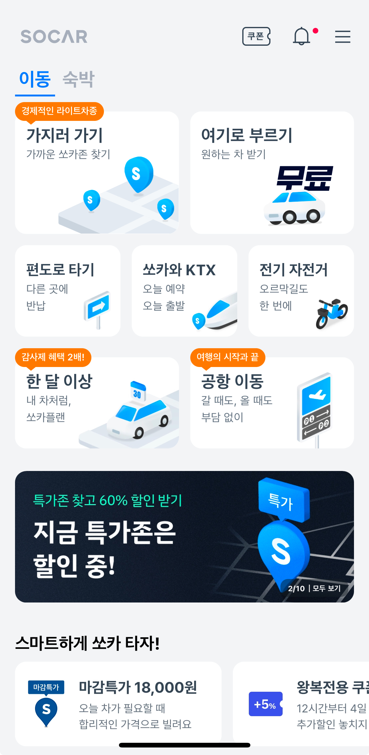 쏘카는 차량 공유 서비스를 제공하는 플랫폼으로 개인 차량 없이도 언제 어디서나 간편하게 차량을 빌릴 수 있는 서비스입니다. 특히 여행, 출장, 간단한 이동 시 매우 유용하게 활용할 수 있습니다.