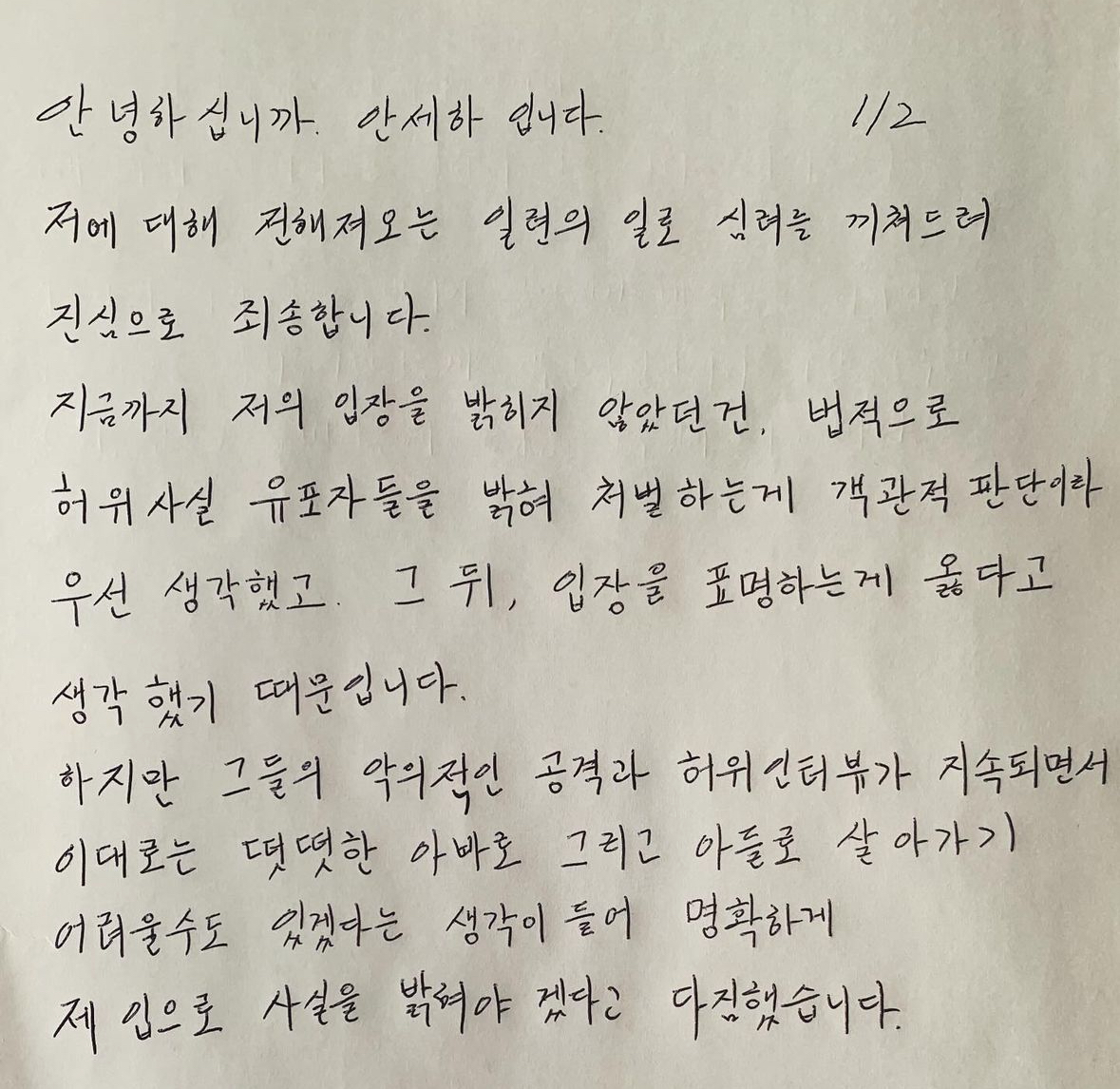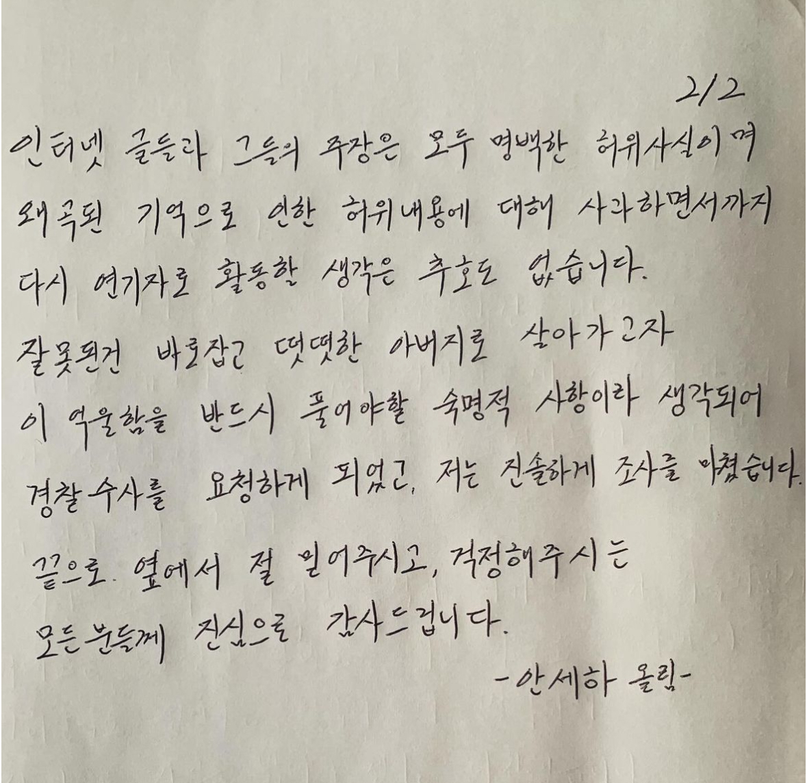 10일, 안세하 배우는 인스타그램 개인계정에 자필 입장문을 업로드 했다.