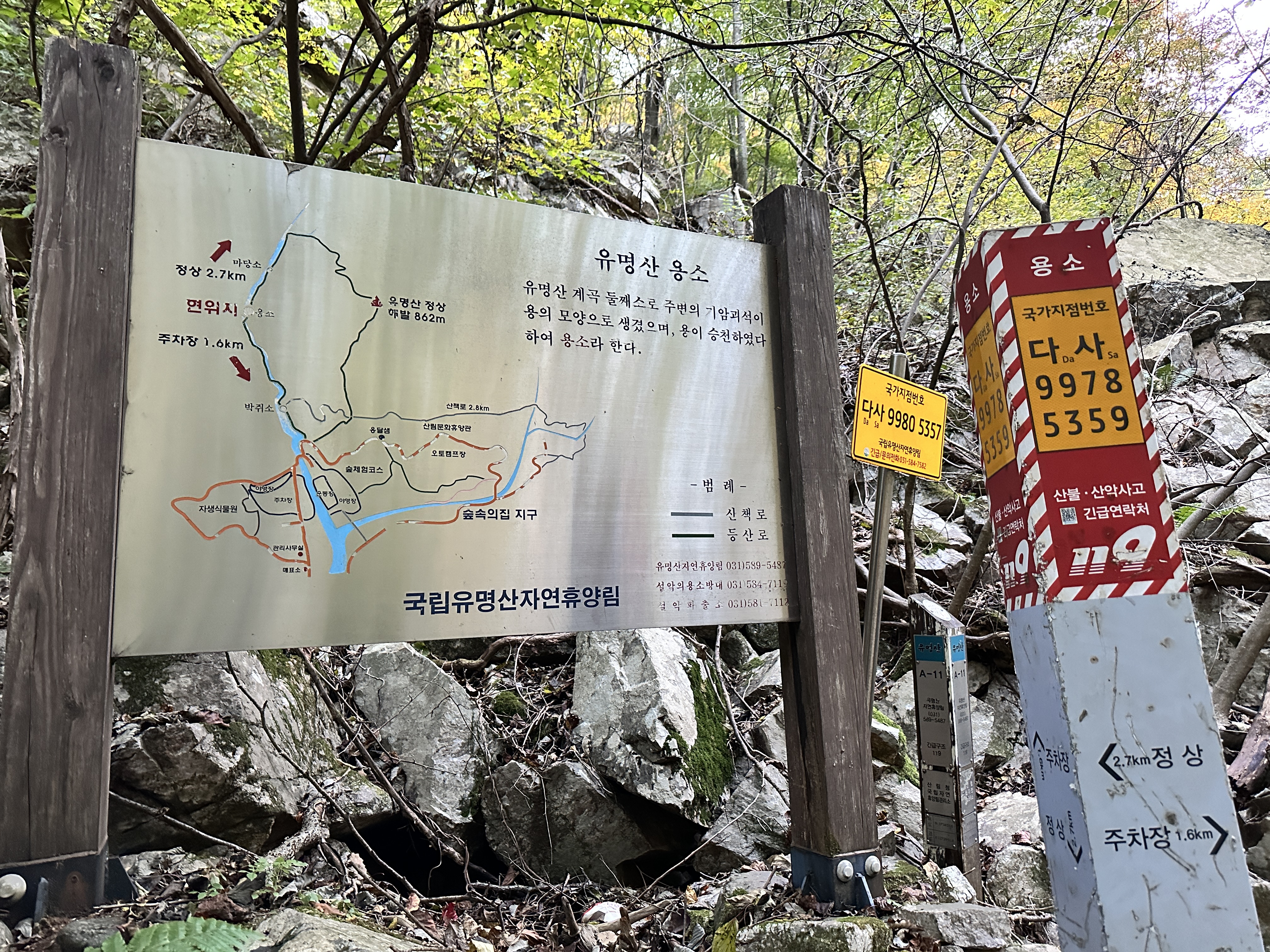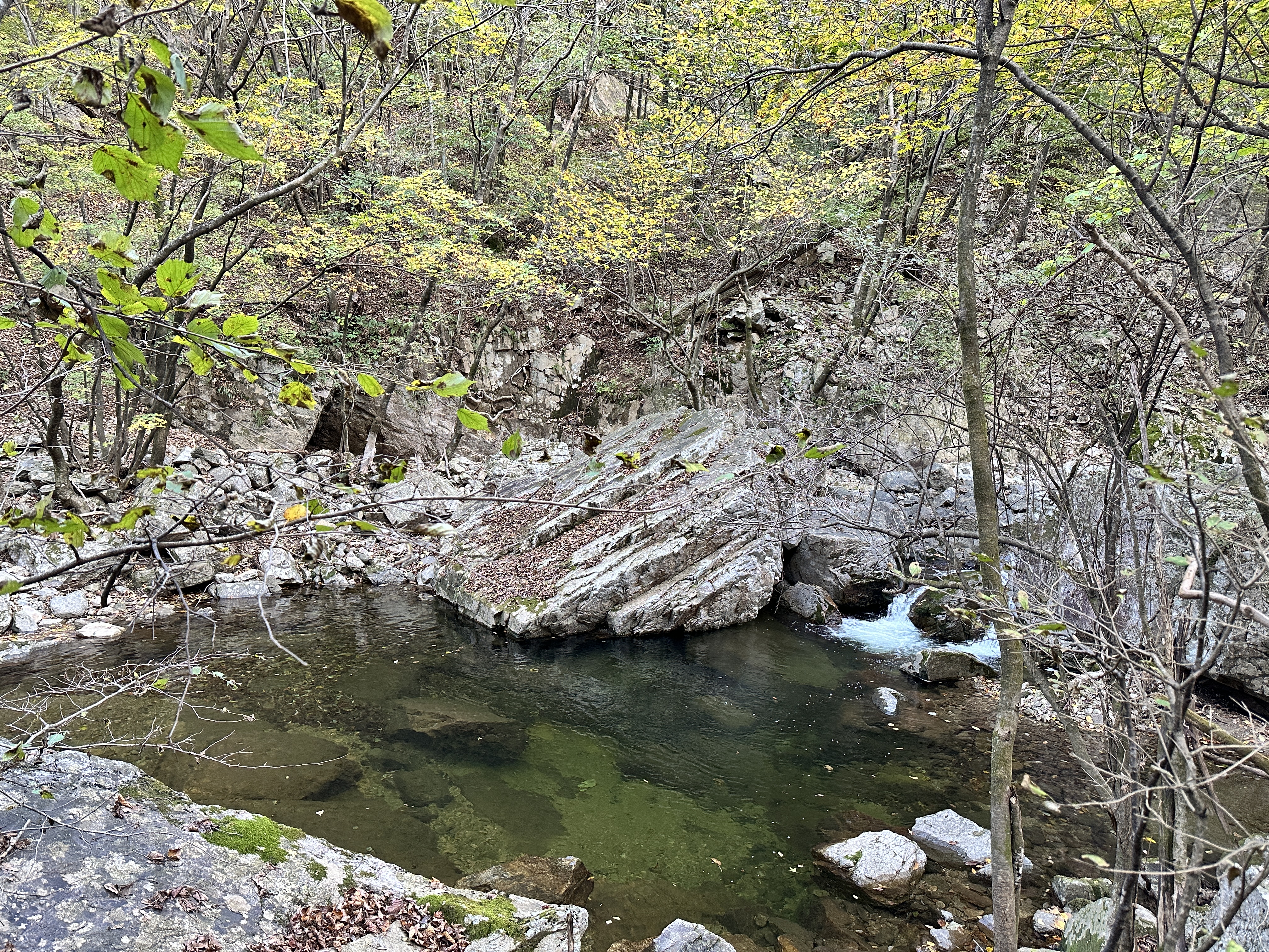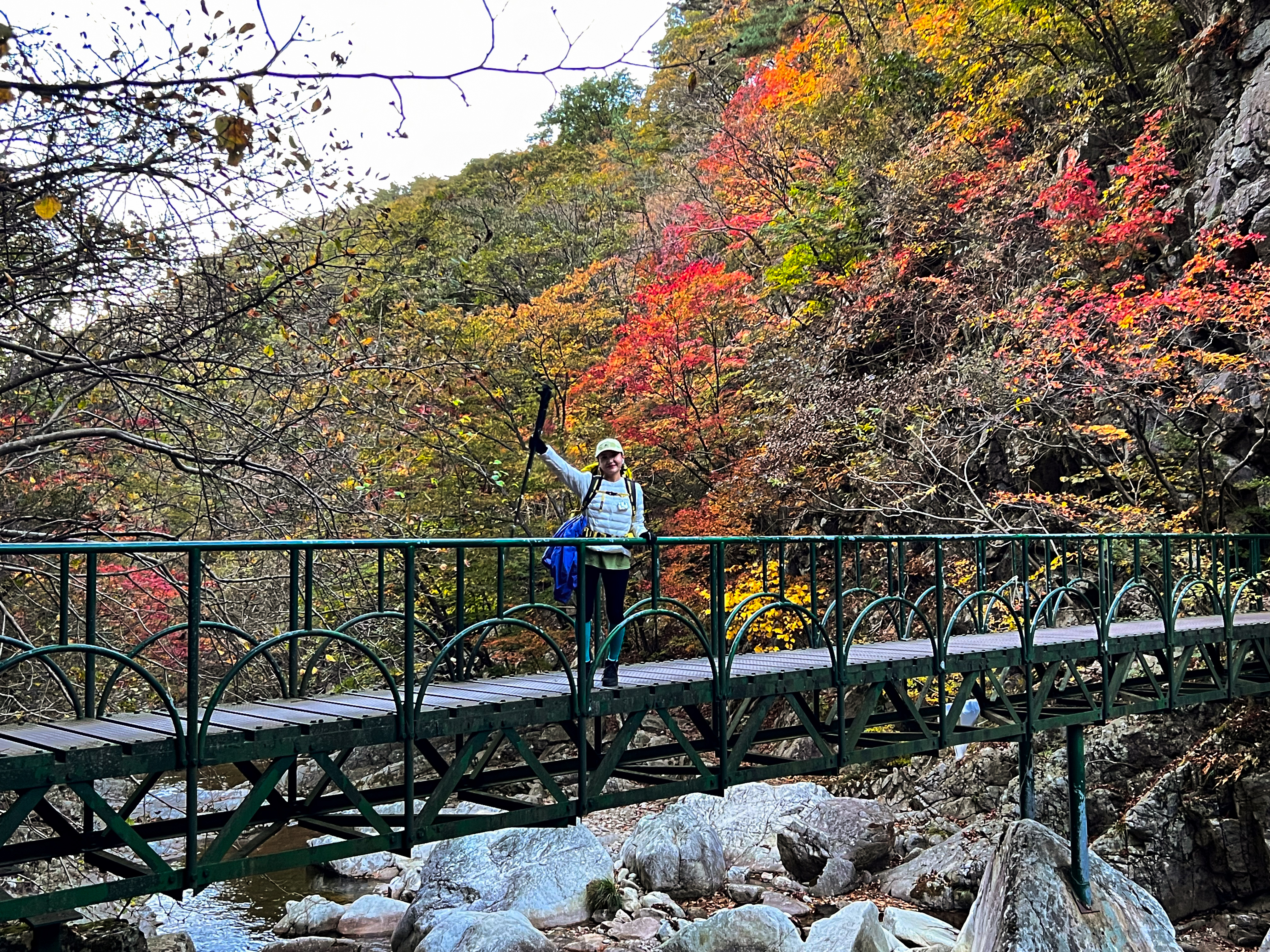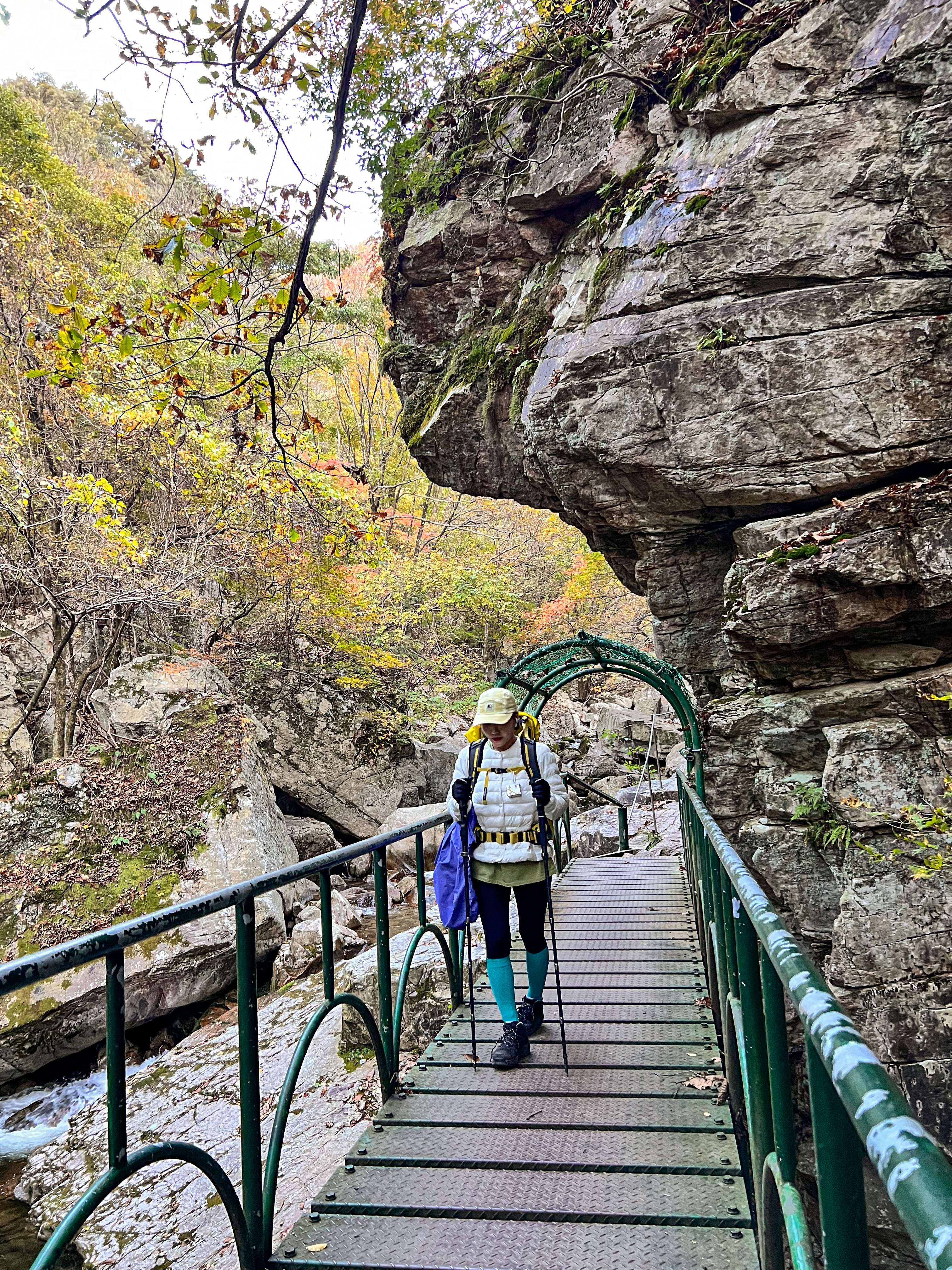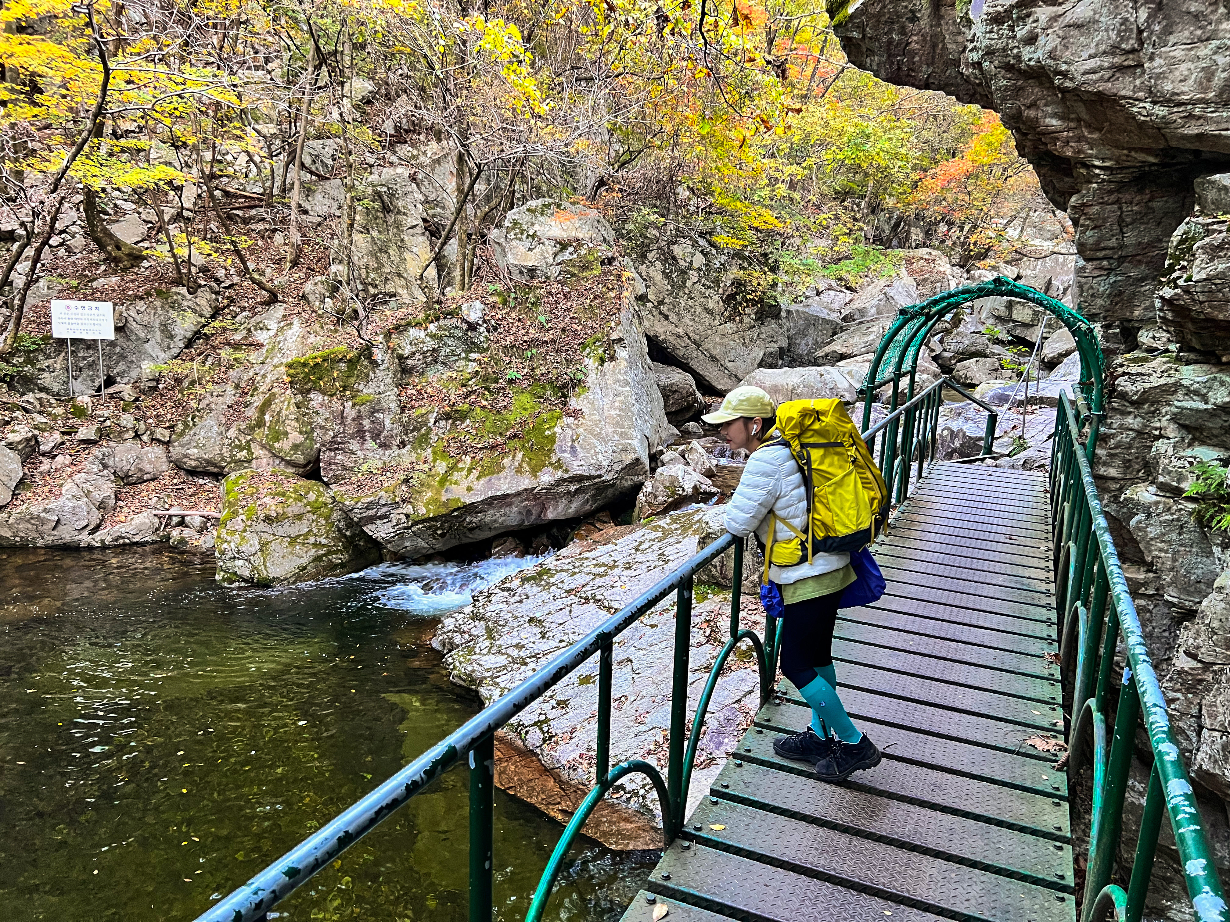드디어 땀이 나기 시작해 겉옷 벗고 도착한 용소. 너무 멋지다. 암석들 밑으로 지나가는 구간도 몇 있었다. 다리 위에서 투벅투벅.