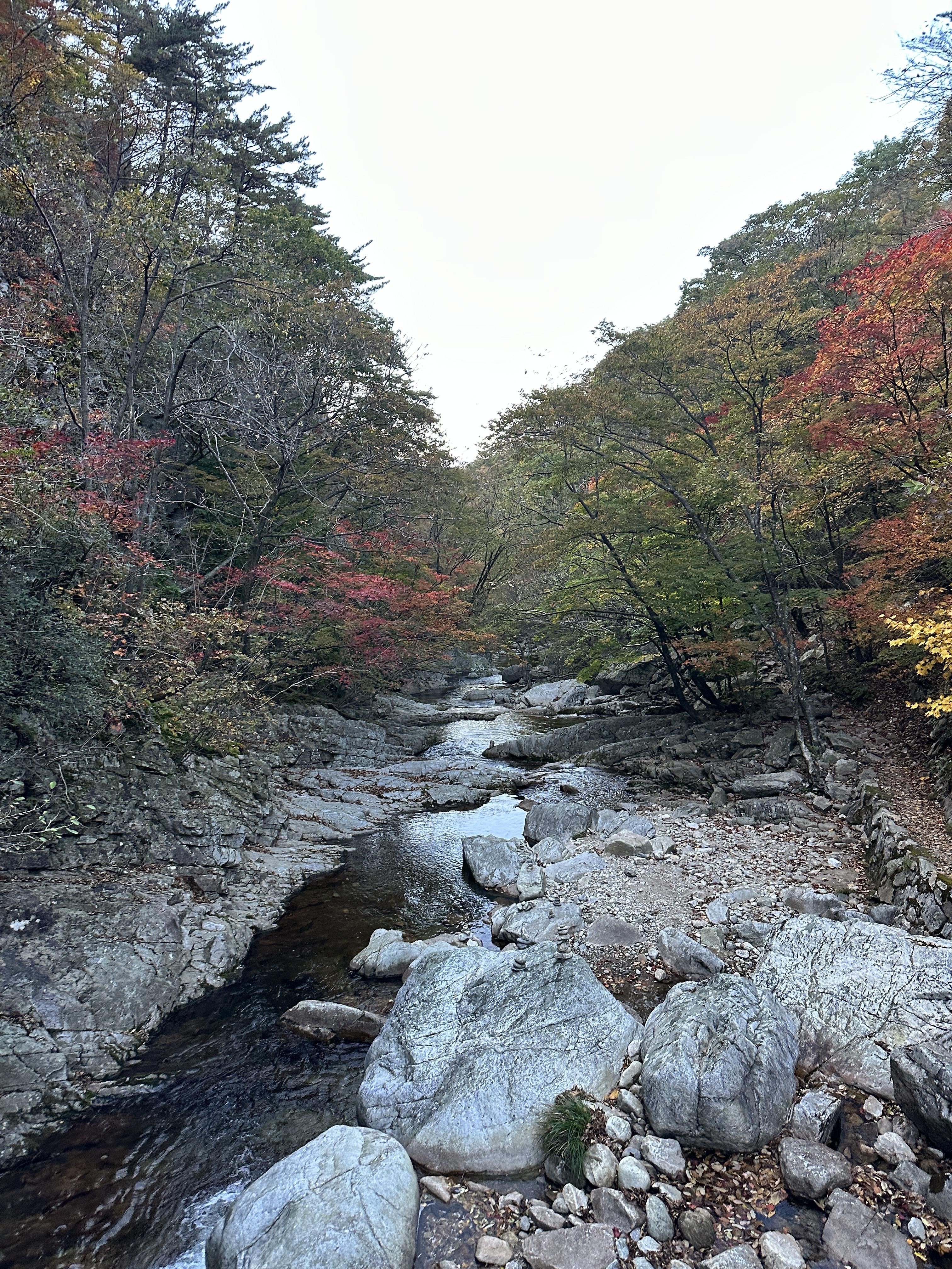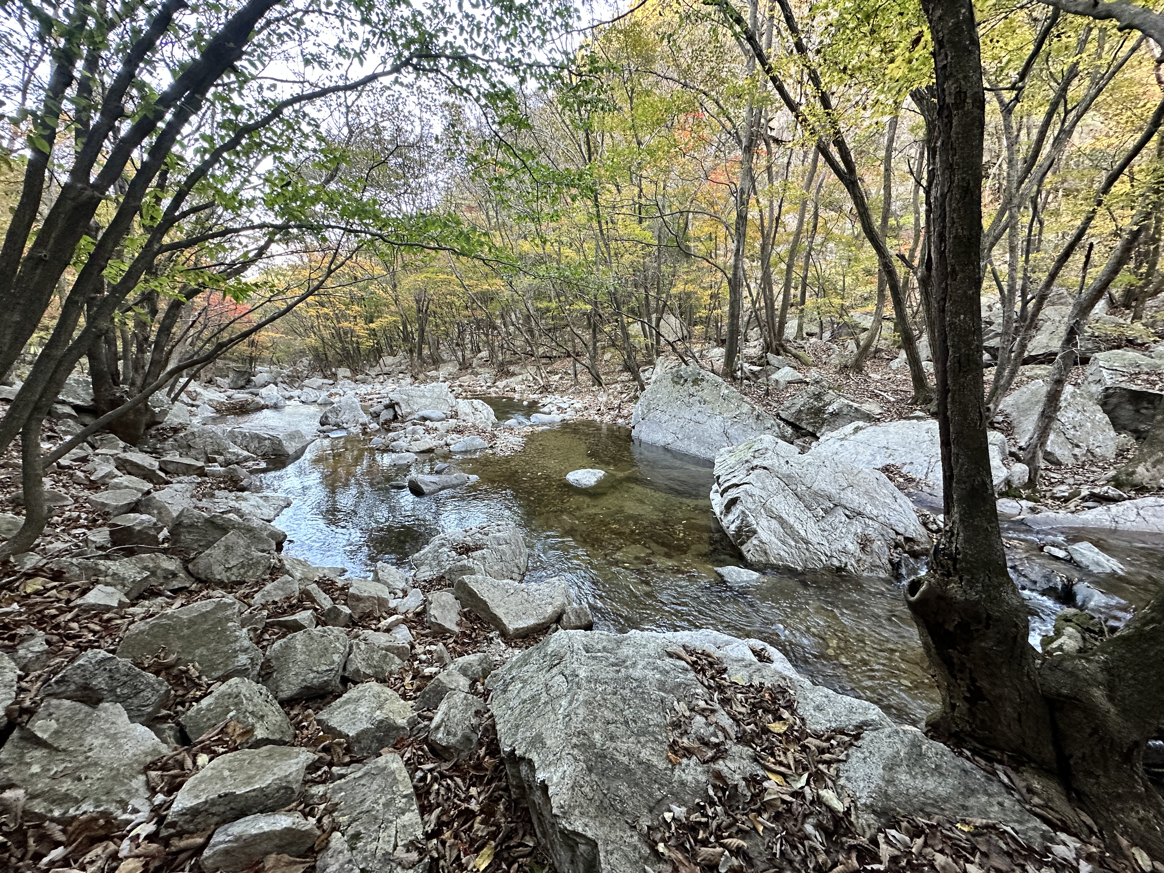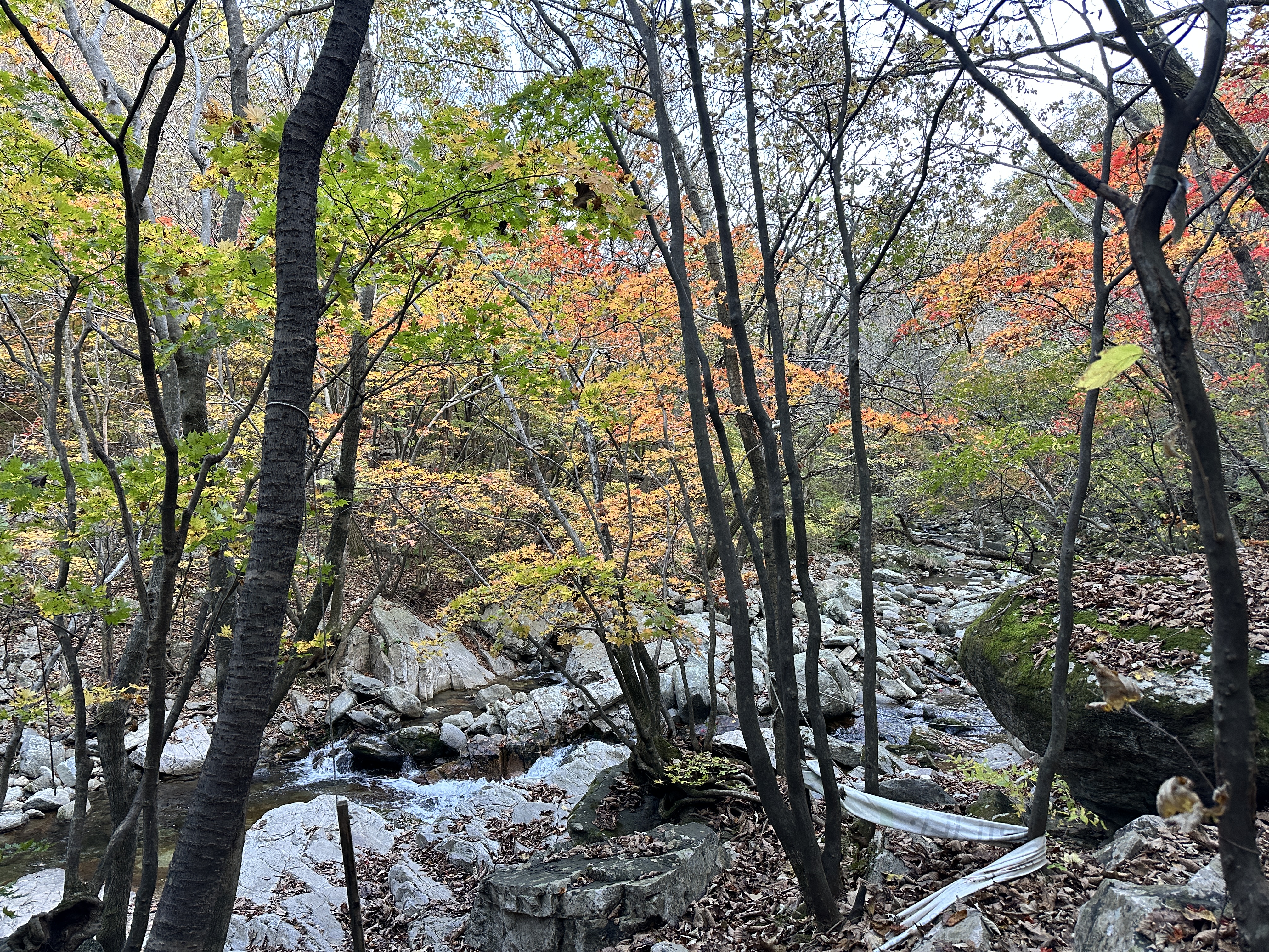 쭉 뻗은 계곡 길, 알록 달록 떨어진 낙엽길이 이뻤다. 한참 감상중에 낙엽 밟고 미끄러져 넘어져버렸다. 한눈 판 나의 불찰. 발목을 삐끗할뻔 했지만 등산화가 잡아준 덕에 이 정도지만 혹시나 해서 파스를 뿌리고 다시 내려 갔다. “괜찮아.”
