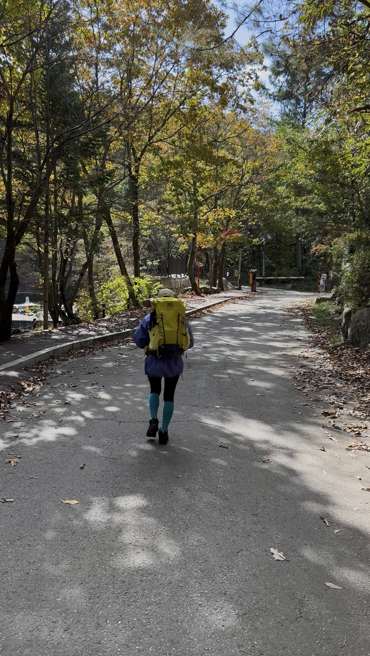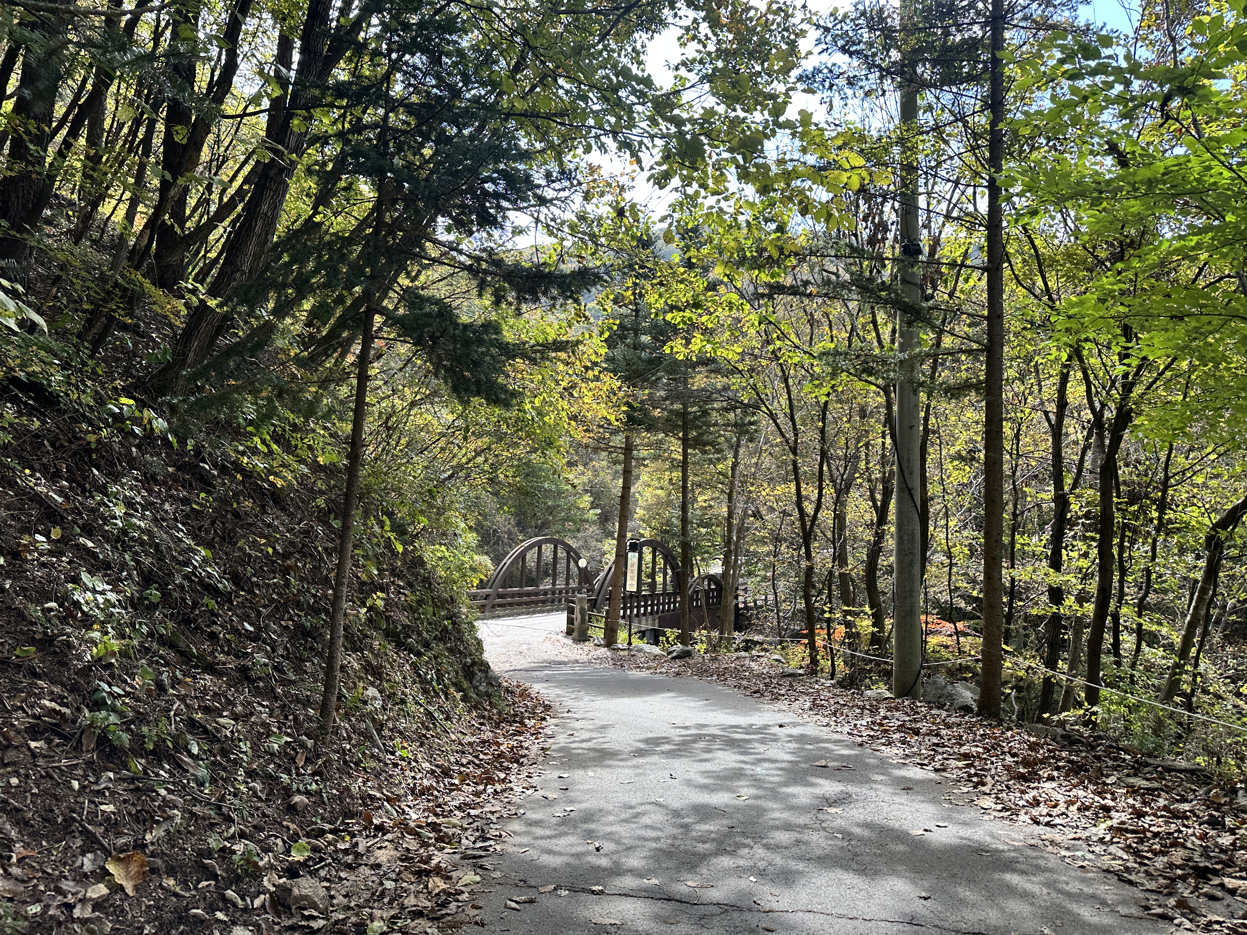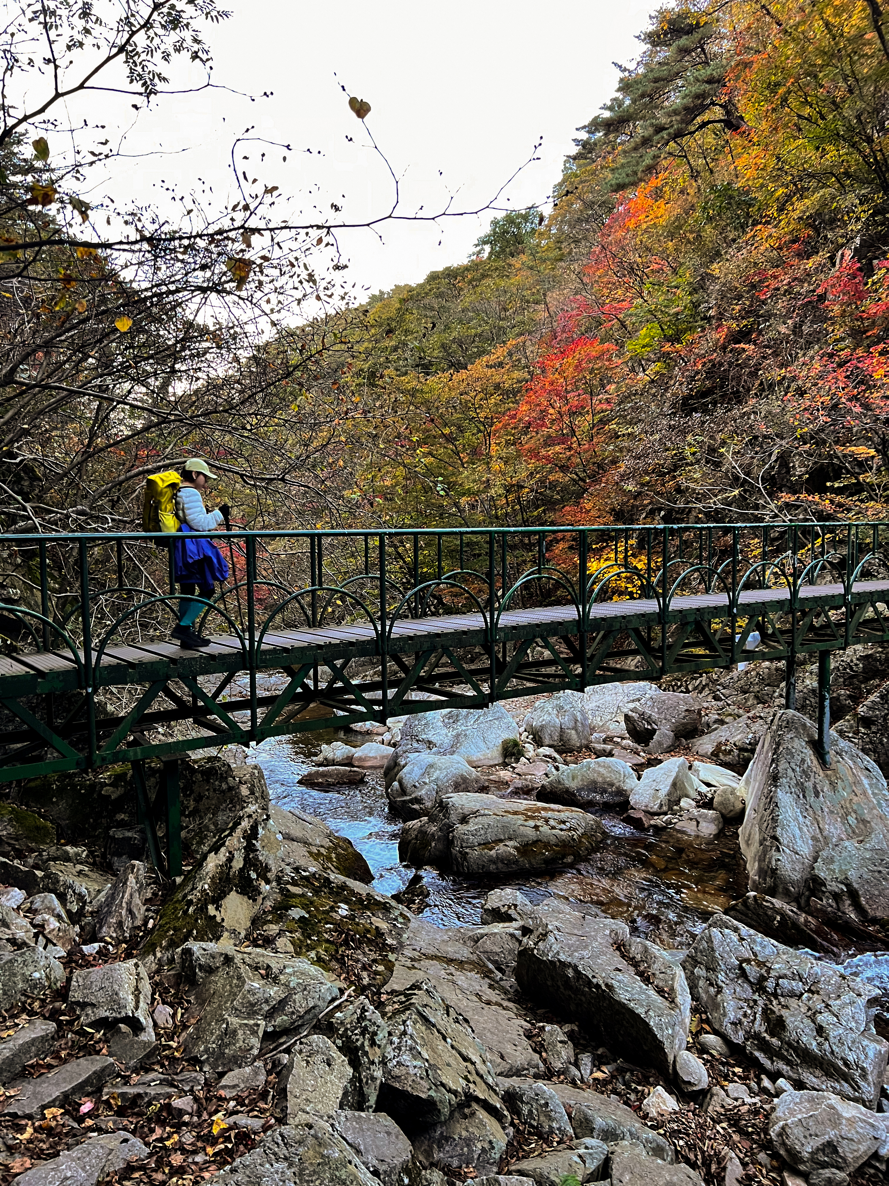 쭉 뻗은 계곡 길, 알록 달록 떨어진 낙엽길이 이뻤다. 한참 감상중에 낙엽 밟고 미끄러져 넘어져버렸다. 한눈 판 나의 불찰. 발목을 삐끗할뻔 했지만 등산화가 잡아준 덕에 이 정도지만 혹시나 해서 파스를 뿌리고 다시 내려 갔다. “괜찮아.”