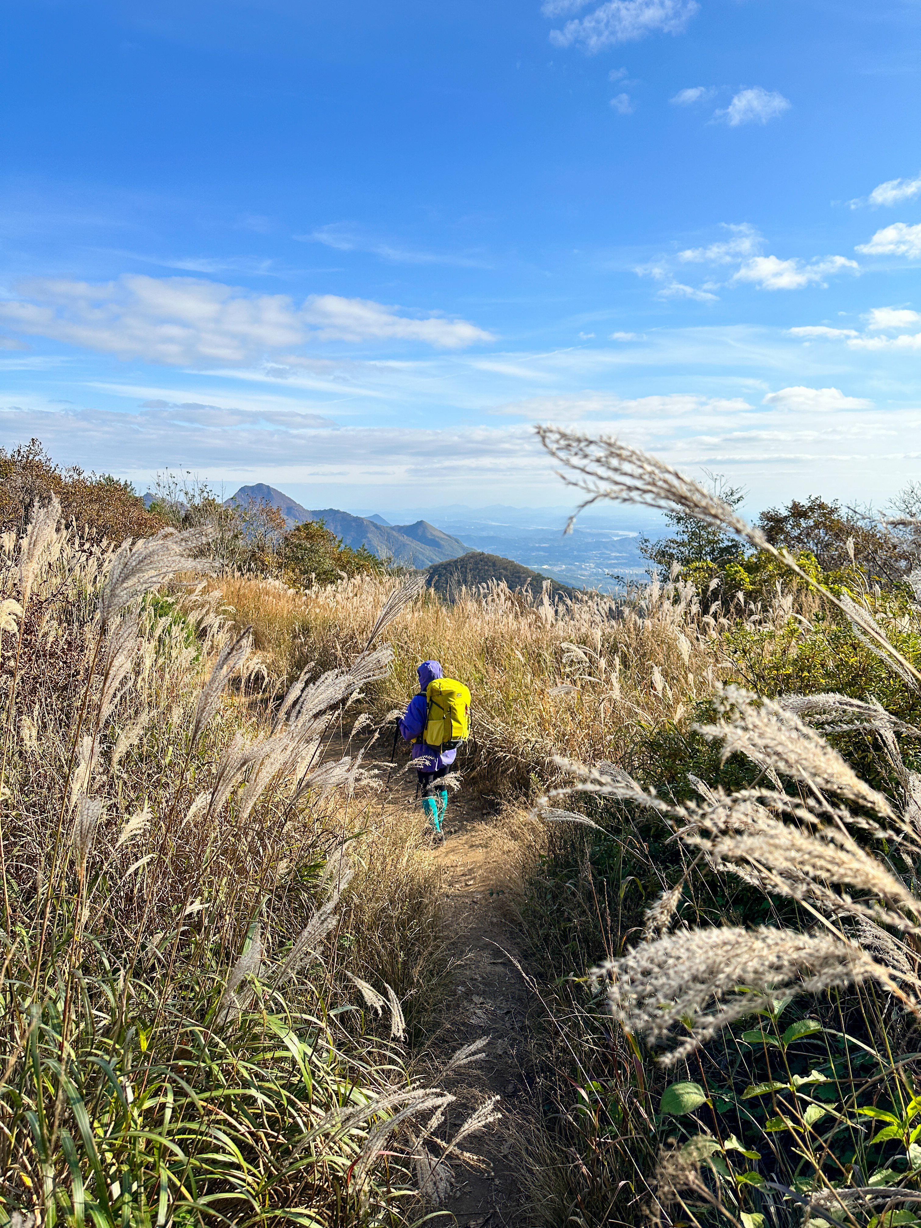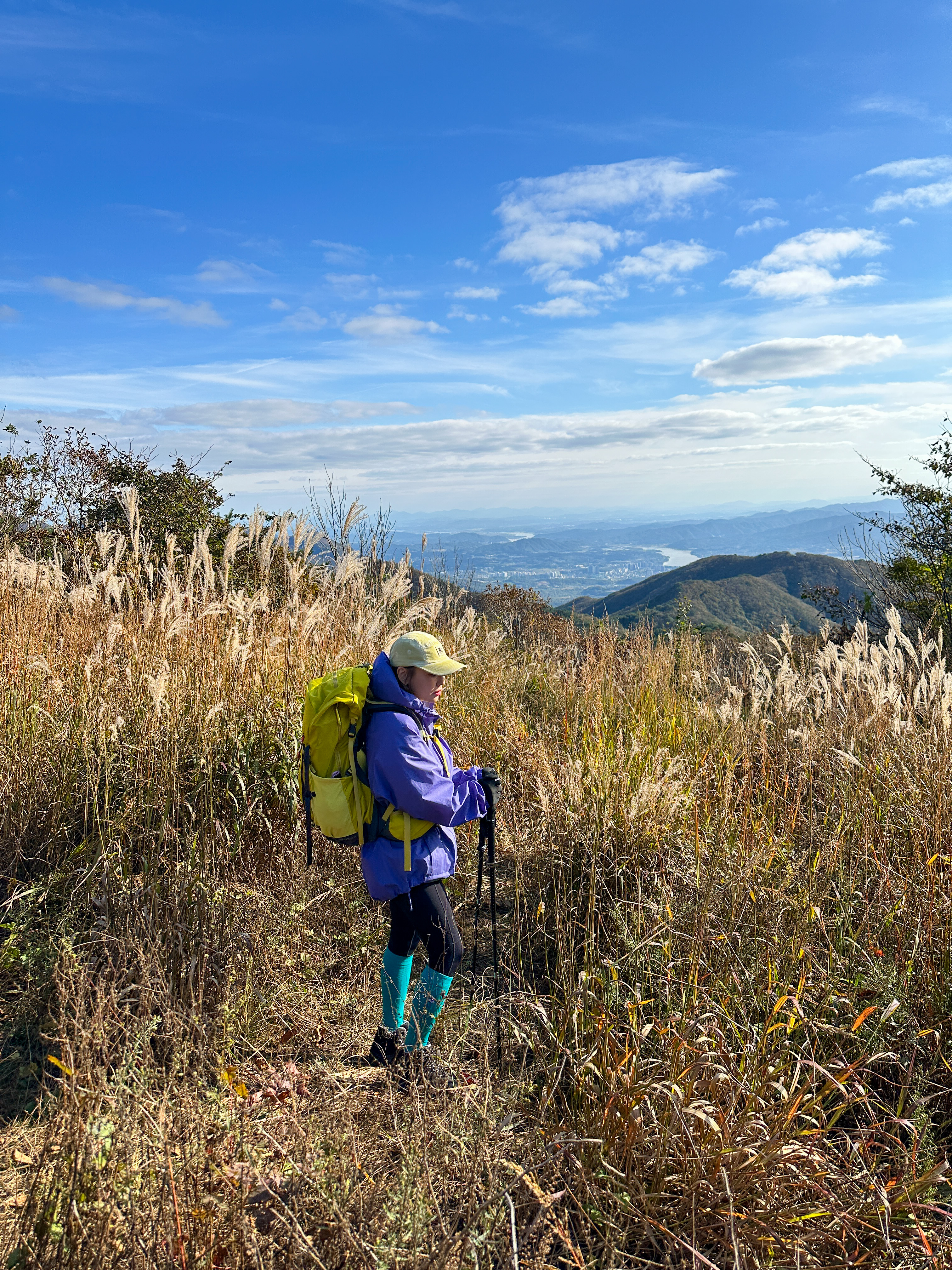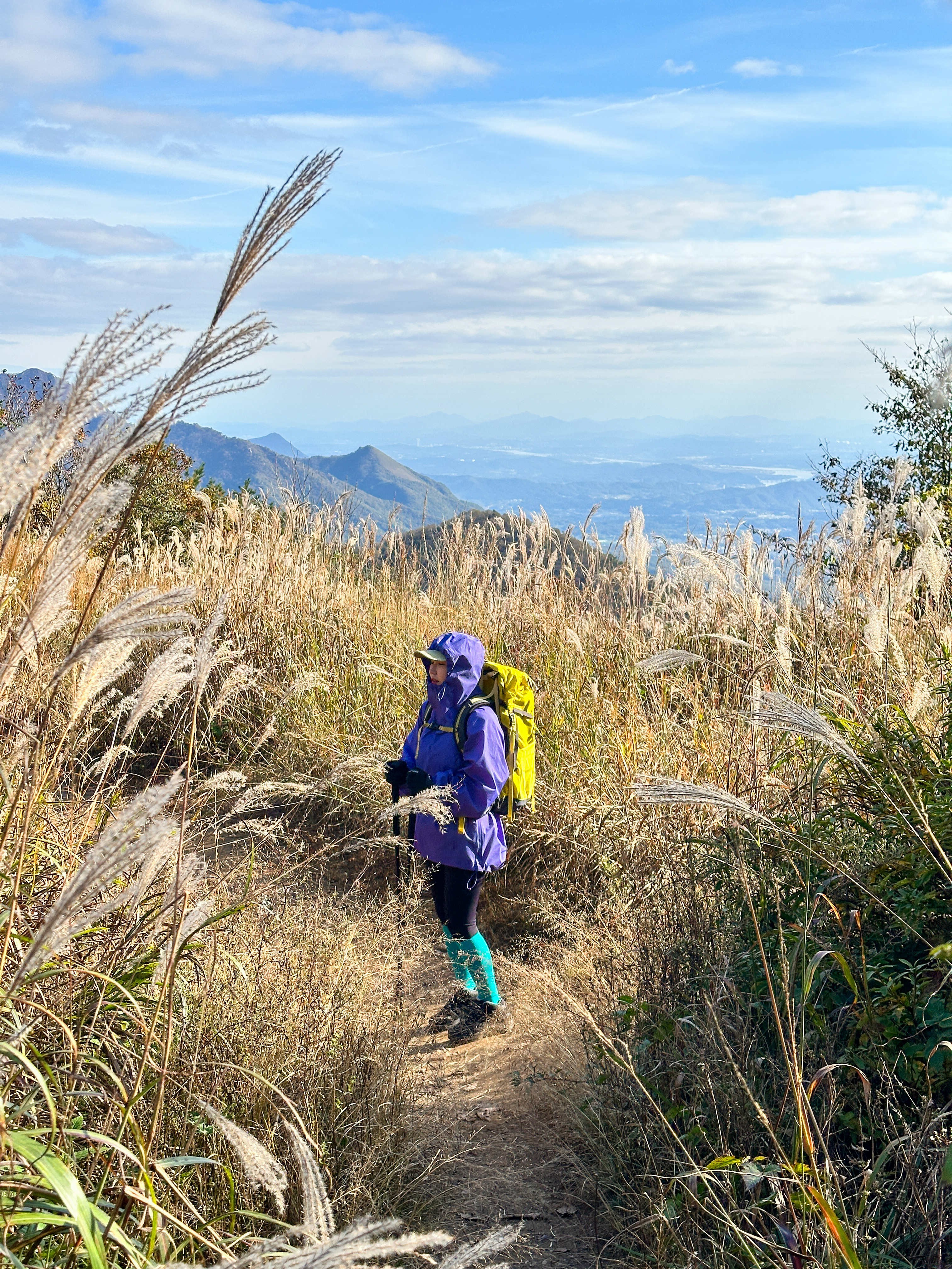 정상에서 5분 정도 내려가니 억새들이 널려 있었다. 이건 찍어야지. “여기서 나 좀 찍어줘요.” 하산길엔 전망이 조금씩 보인다.