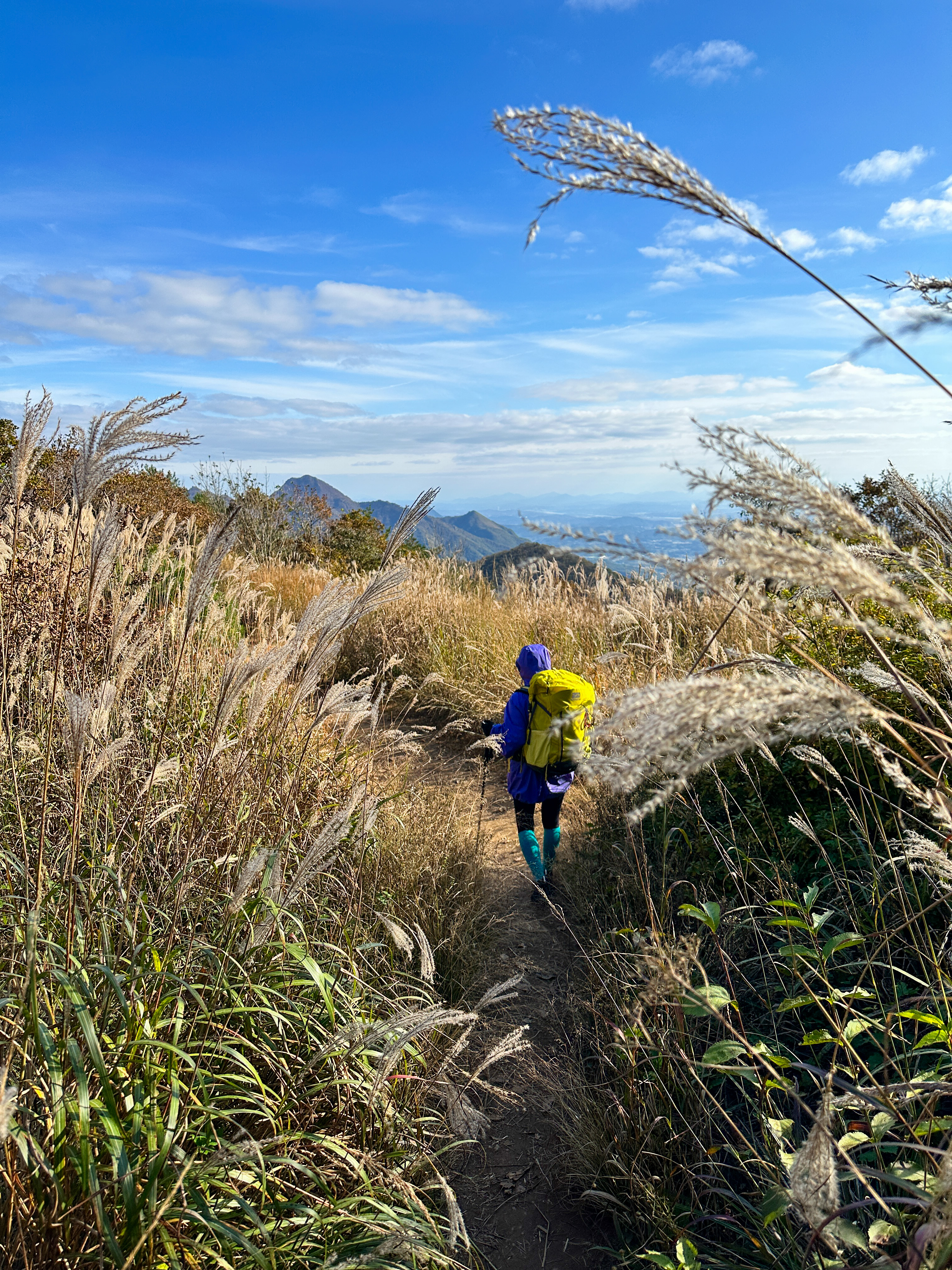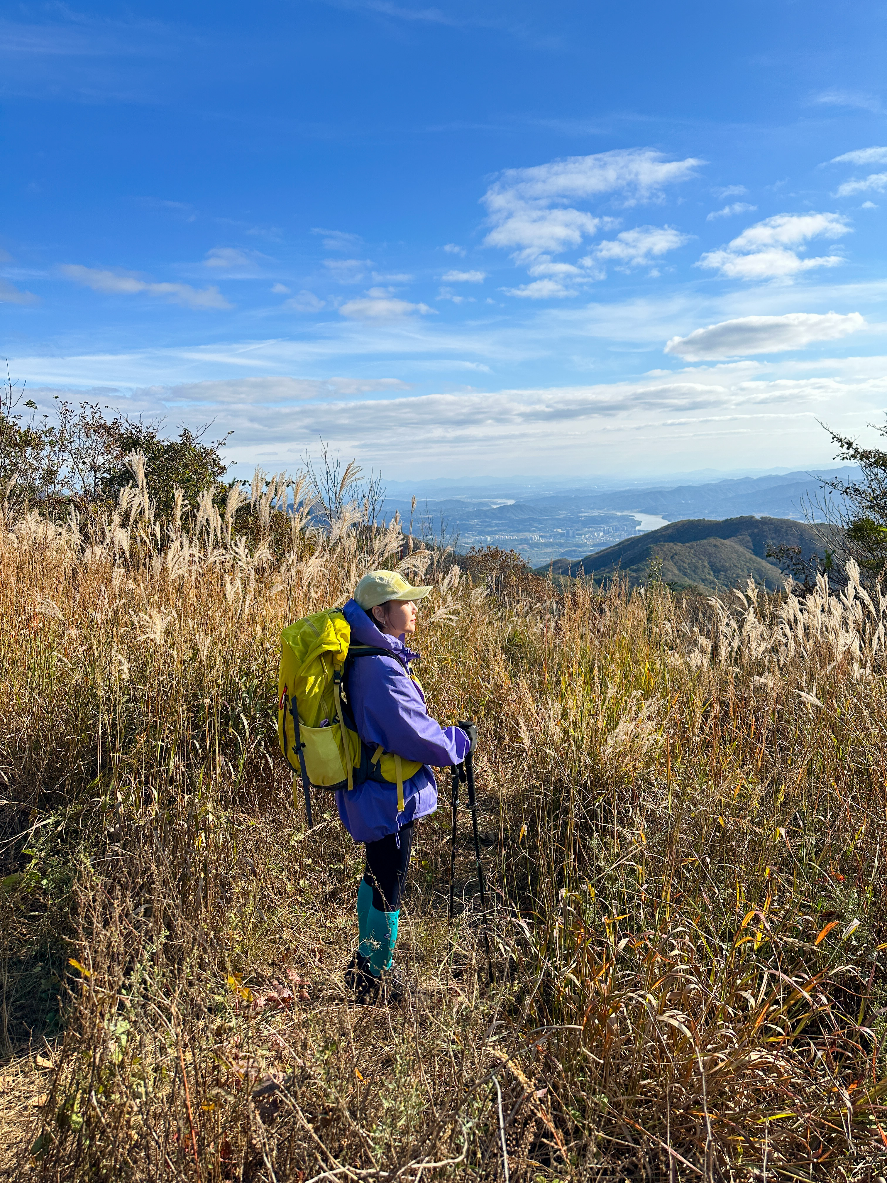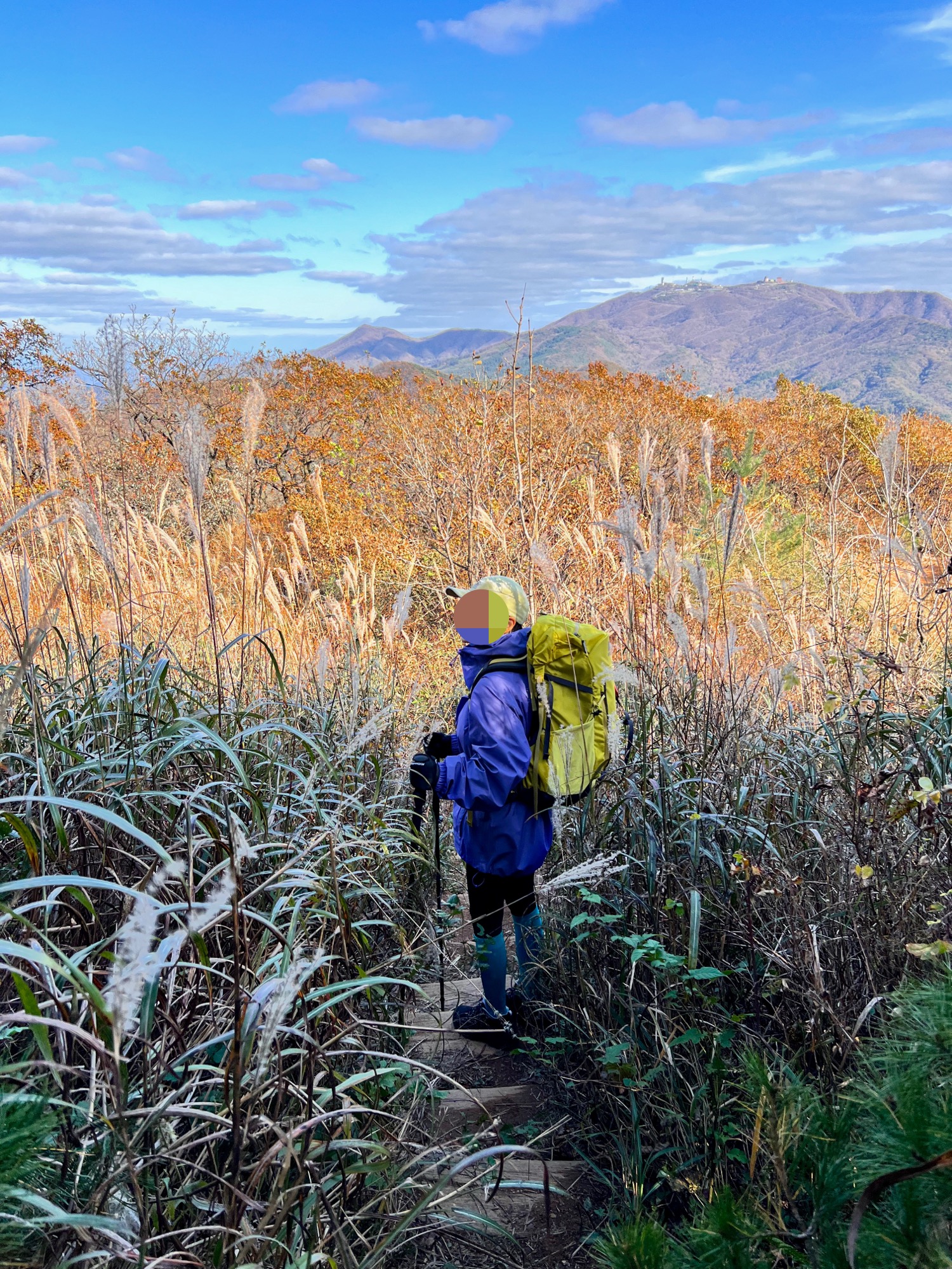 정상에서 5분 정도 내려가니 억새들이 널려 있었다. 이건 찍어야지. “여기서 나 좀 찍어줘요.” 하산길엔 전망이 조금씩 보인다.
