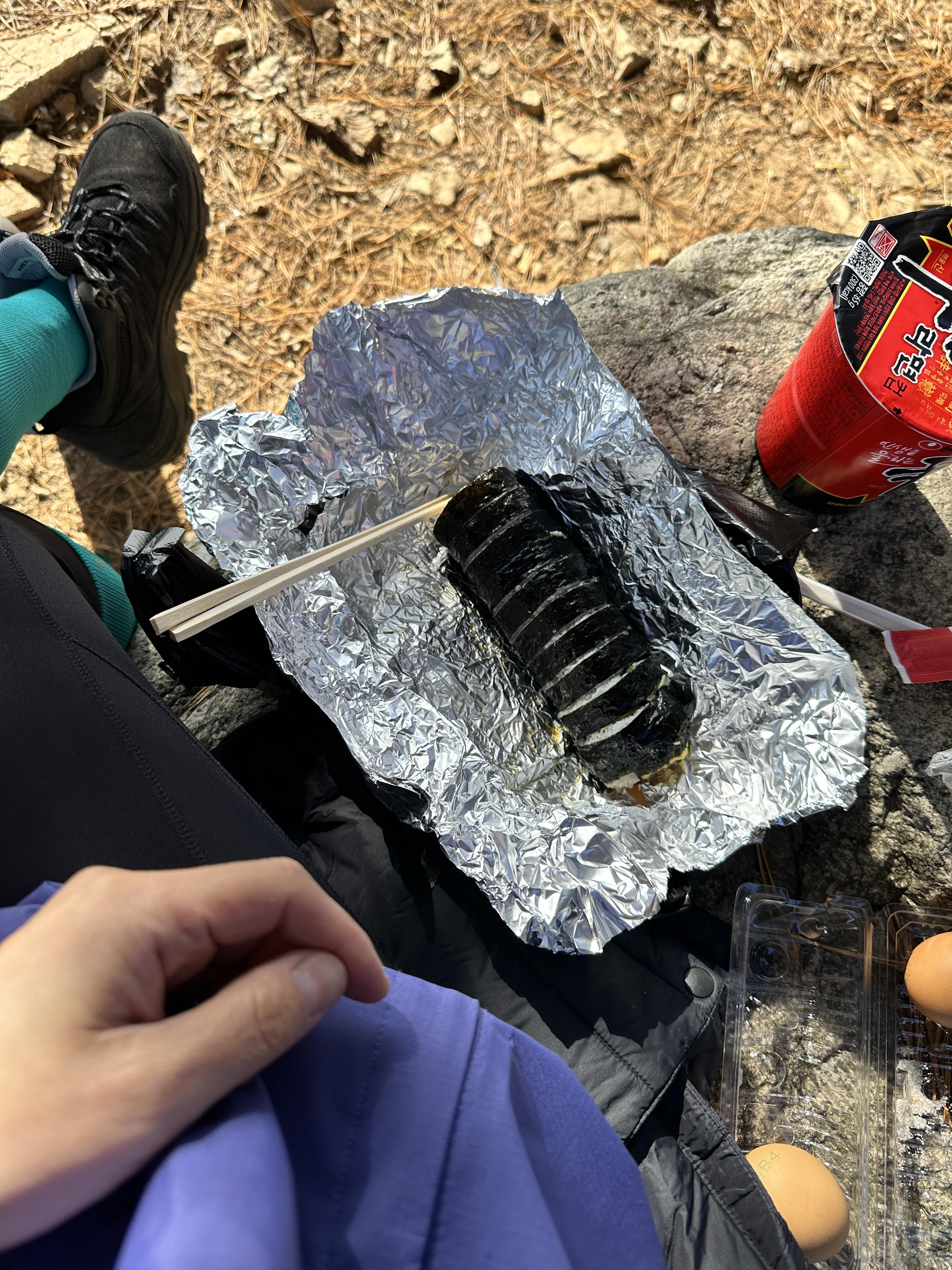 사진까지 찍고 점심을 해결하려 자리를 잡았다. 땀이 금방 식어서 경량패딩과 바막을 후다닥 걸쳤다.