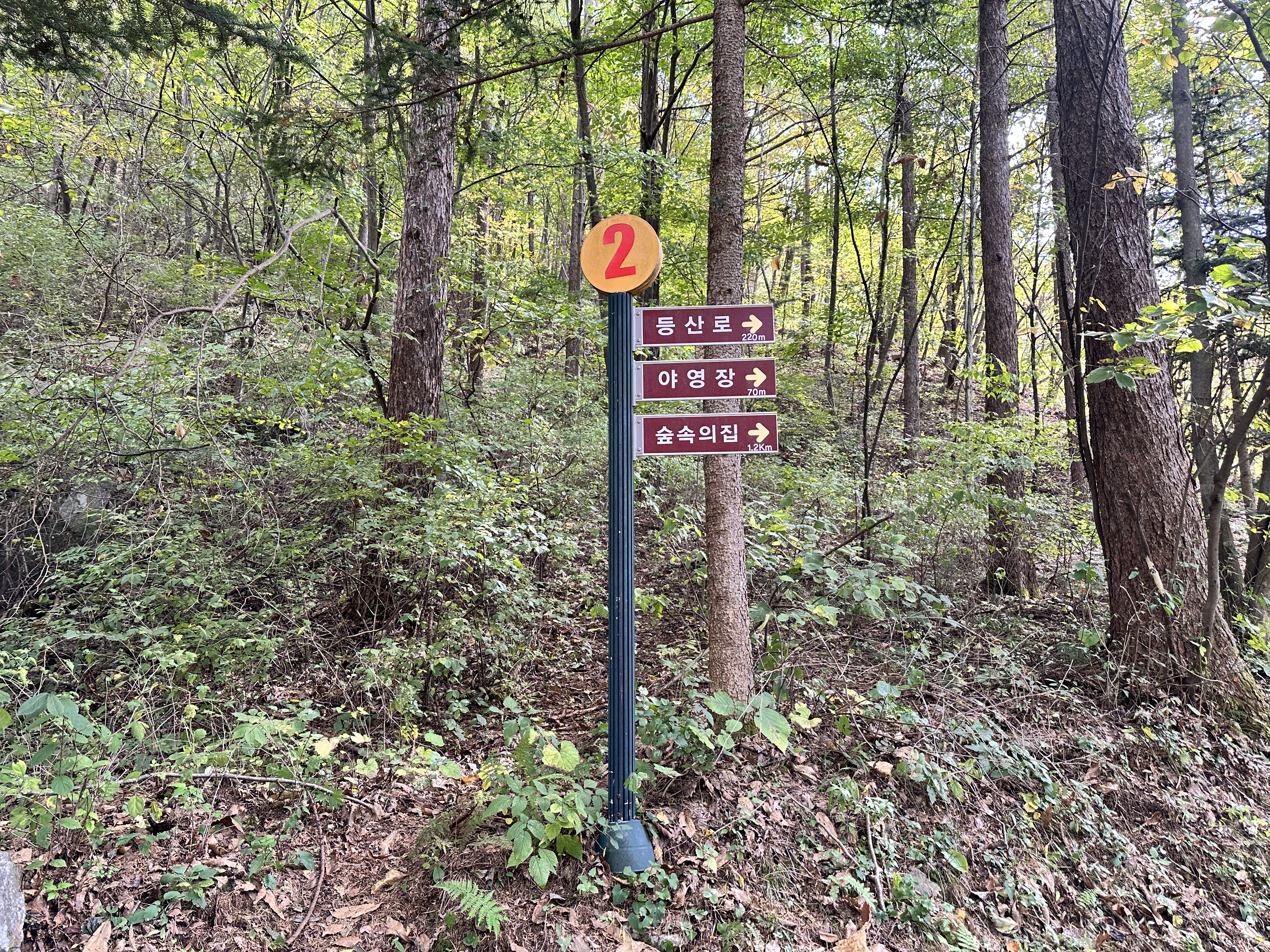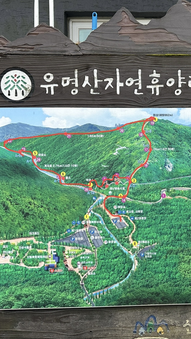 주차장에서 길따라 위로 걸어가다보면 우측에 캠핑장을 거쳐 만난 등산로지도가 보인다. “그래, 우리 정상 찍고 계곡길로 이렇게 내려 오면 되겠다.” 하고 눈으로 훑고 올라 가기 시작했다.