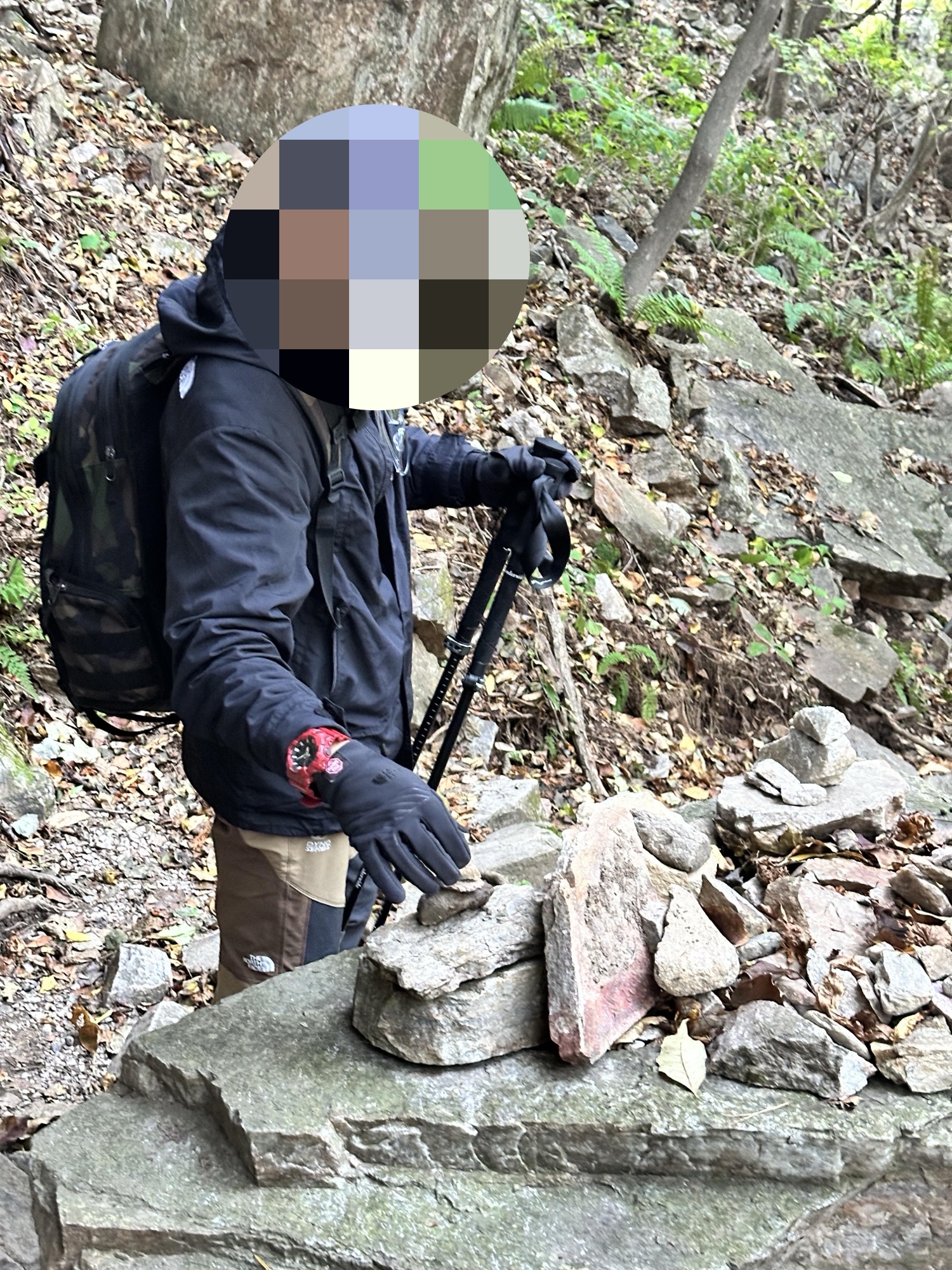 아. 이런, 주차장에서 방석을 안들고 왔네. 바위 위에 그냥 걸터앉아 배를 채우고 내려 가기로 했다. 다 먹고나니 너무 추워지기 시작해서 기온을 보니 더 내려 간것이냐. 10도다. 더 추워지기전에 가자. “오늘 날씨, 참 이상해.” 후드 뒤집어 쓰고 내려 가야 할만큼 귀가 시렵고 두통이 있어서 타이레놀 한 알을 먹고 출발했다.