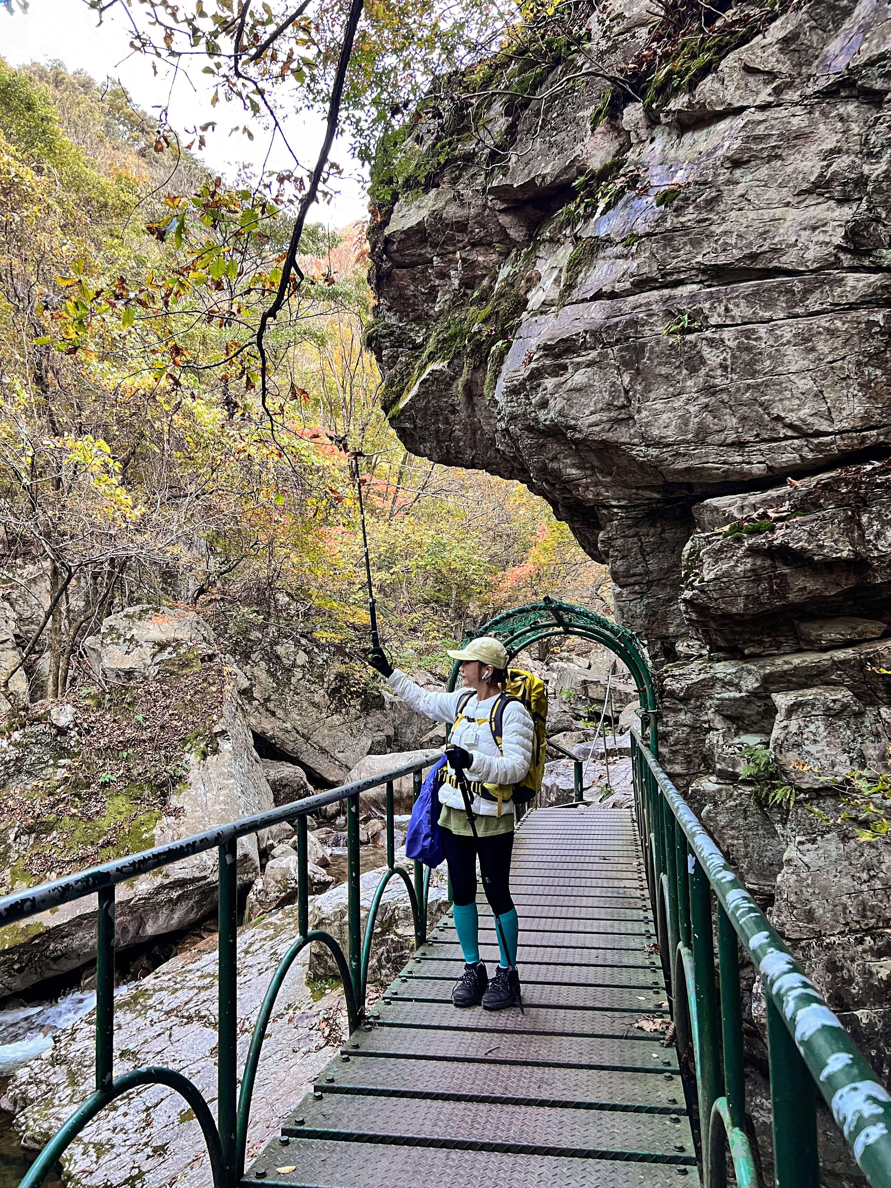 드디어 땀이 나기 시작해 겉옷 벗고 도착한 용소. 너무 멋지다. 암석들 밑으로 지나가는 구간도 몇 있었다. 다리 위에서 투벅투벅.