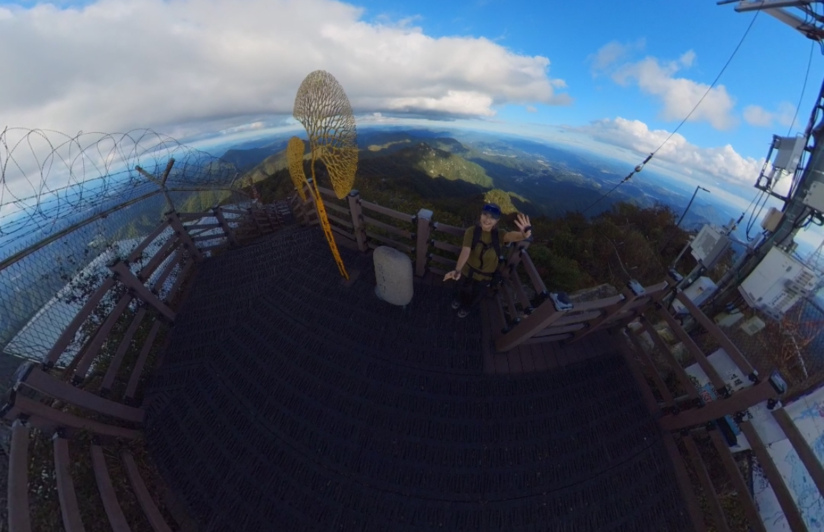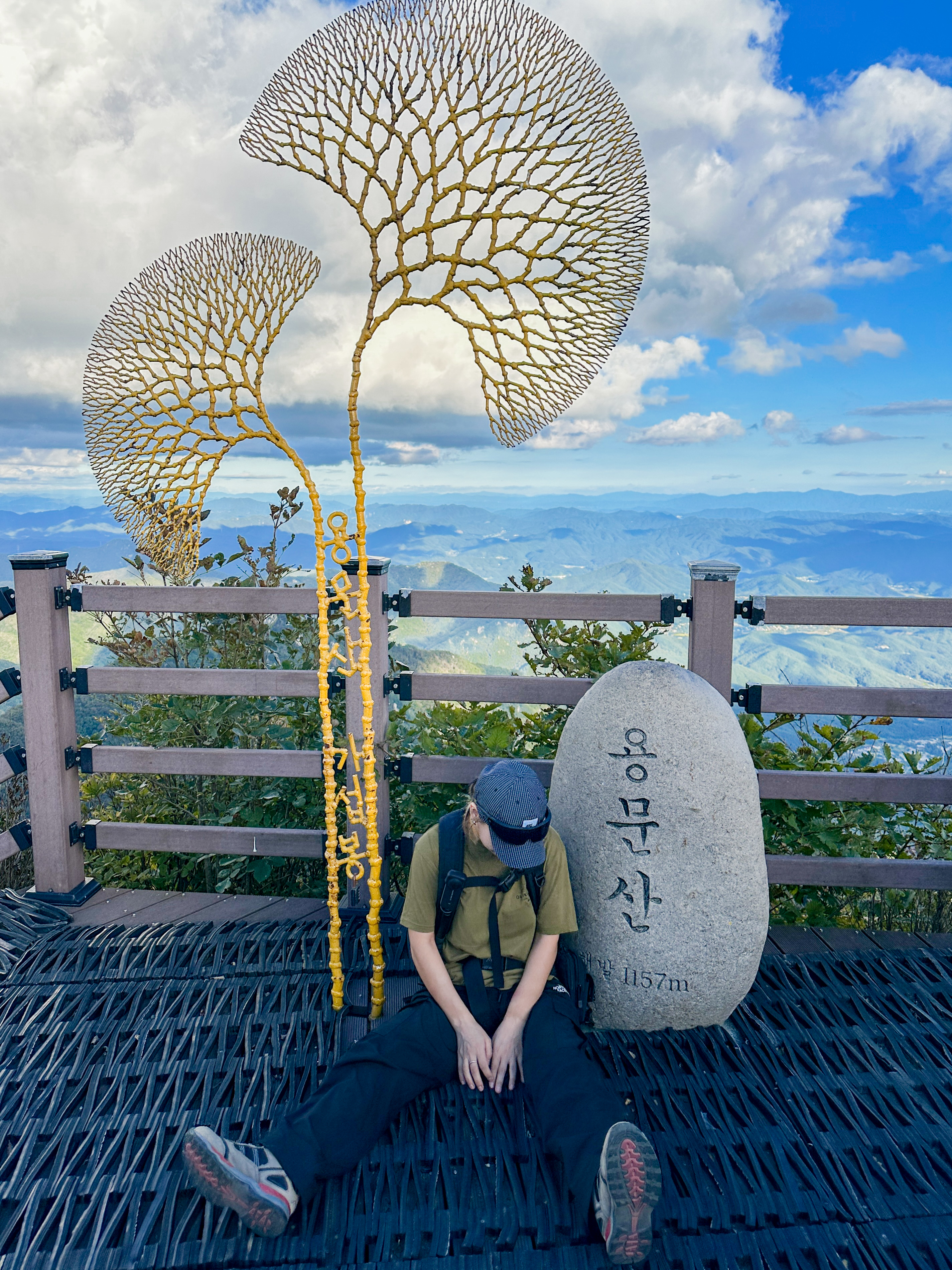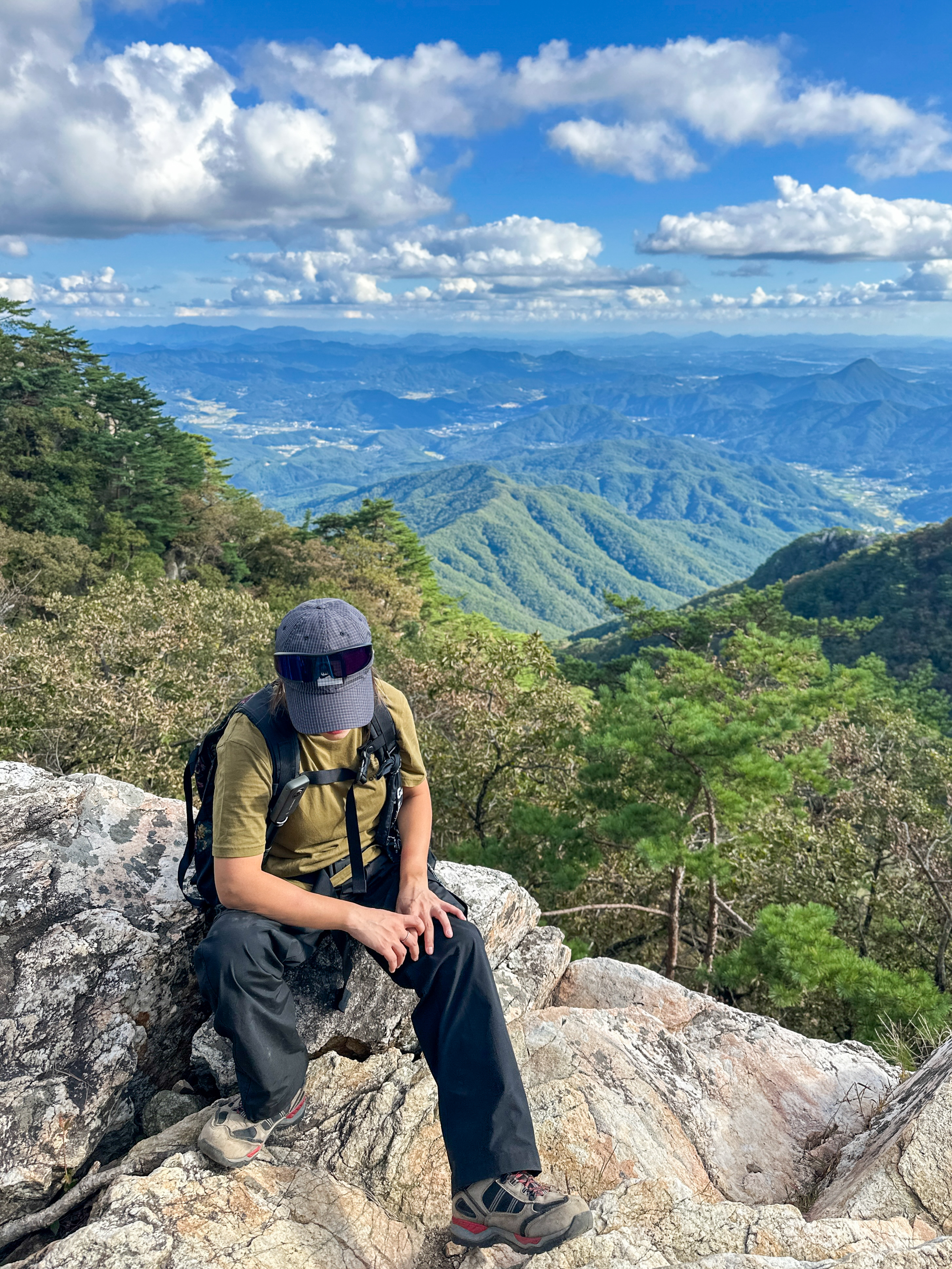 정상에 온 것만으로도 너무 뿌듯. 몇 시간 만에 도착했을까. 시간 보면 힘들 것 같아서 보지도 않은 나. 힘든 표정보단 그래도 사진에선 웃어야지 않겠는가. 사실 이렇게 힘들게 온 길을 다시 내려가는 걱정이 되는 산은 처음이었고 당분간 계단이 많은 산은 피하겠다 마음먹었다.