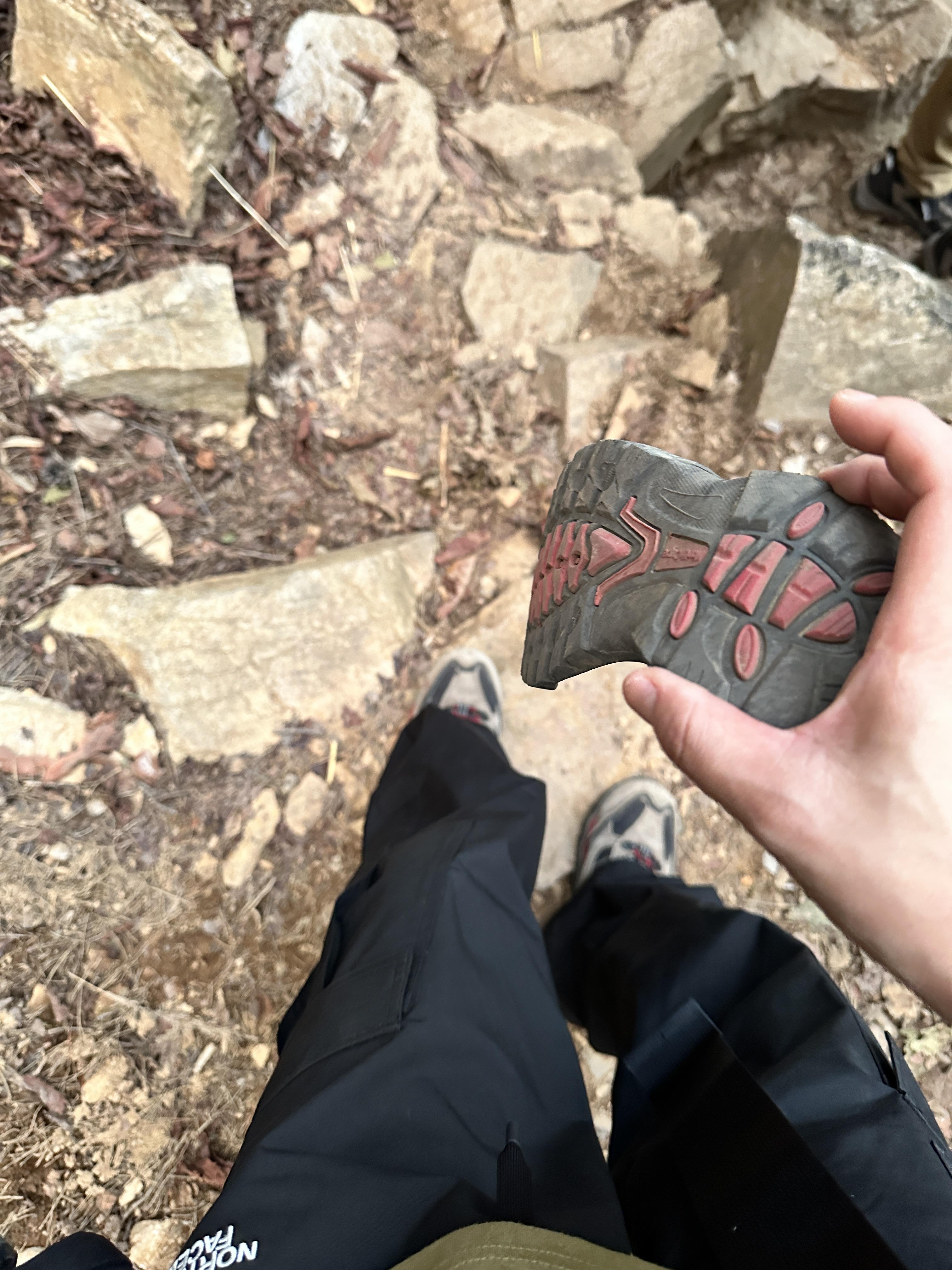 그렇게 한 시간 정도 내려가는데 뒤꿈치가 바위틈에 꼈다. 보다시피 사진처럼 쩍하고 떨어진 밑창. 속으로 “잘 됐다. 이번에 새 등산화 살 수 있다” 좋아 한건 안 비밀! 밑창이 떨어져 버려서 하산하다 대차게 한번 미끄러지고 후들거리는 하체로 네발로 기어 내려오게 한 용문산. 잘 머물다 내려왔다. 이번 산행은 좀 웃픈 상황이 가득했지만 너무 많은 일들을 말하기엔 슬플 것 같아서.