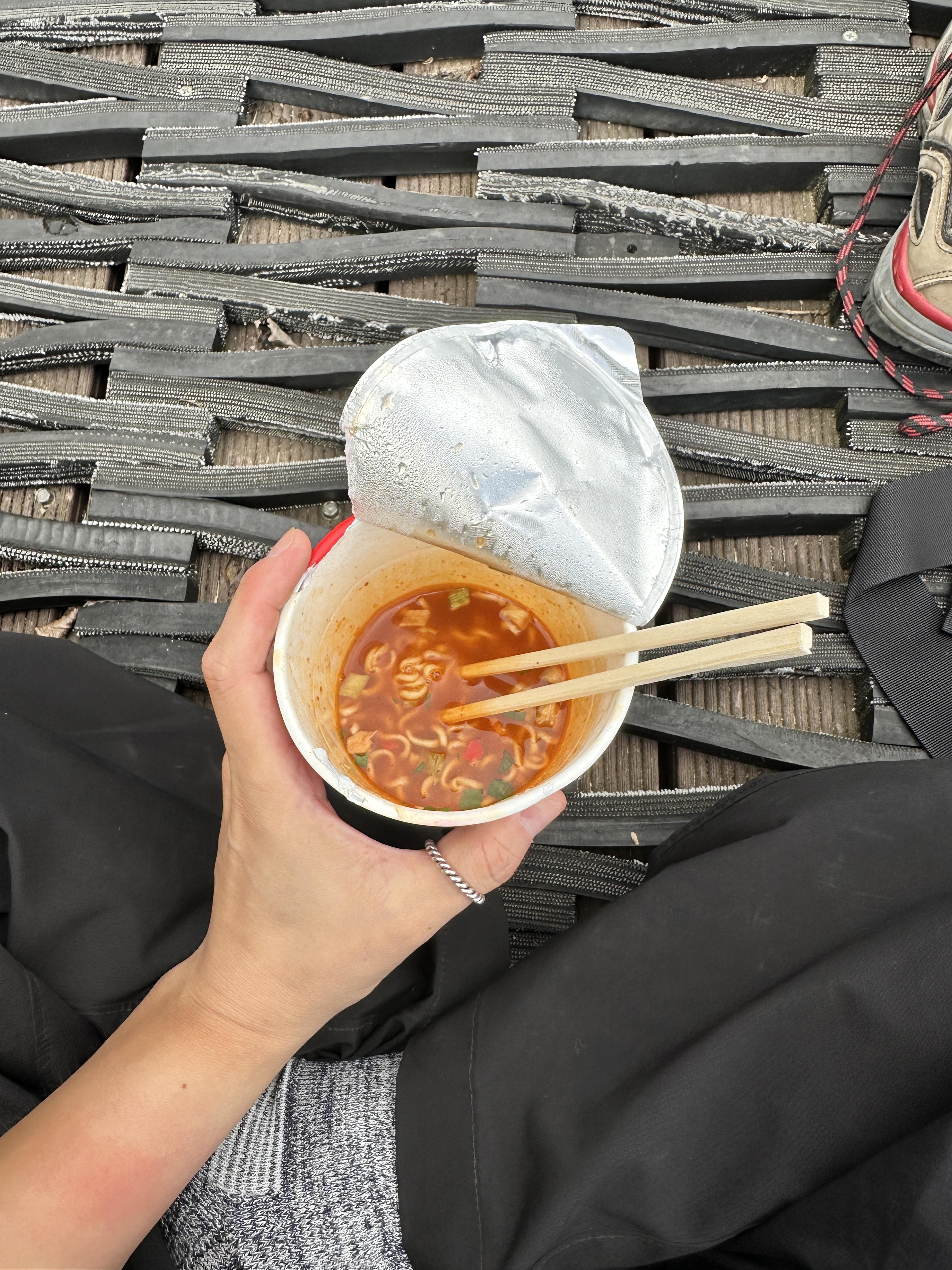 후다닥 짐을 풀고 보온병에 뜨거운 물을 붓고 컵라면을 먹어치웠다. 아침도 안 먹은 상태라 너무 허겁지겁 먹었다.
