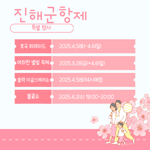 ✔ 불꽃놀이 일정: 2025년 4월 2일(수) 저녁 18:00-20:00 (장소: 진해루 일원)